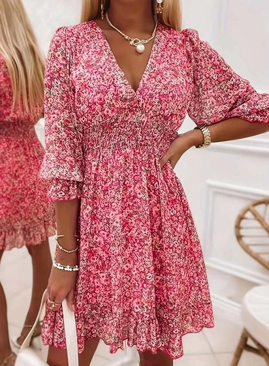 Women's small floral printed V-neck dress, elastic waist design, bohemian fashion casual dress, suitable for daily wear in sprin