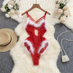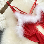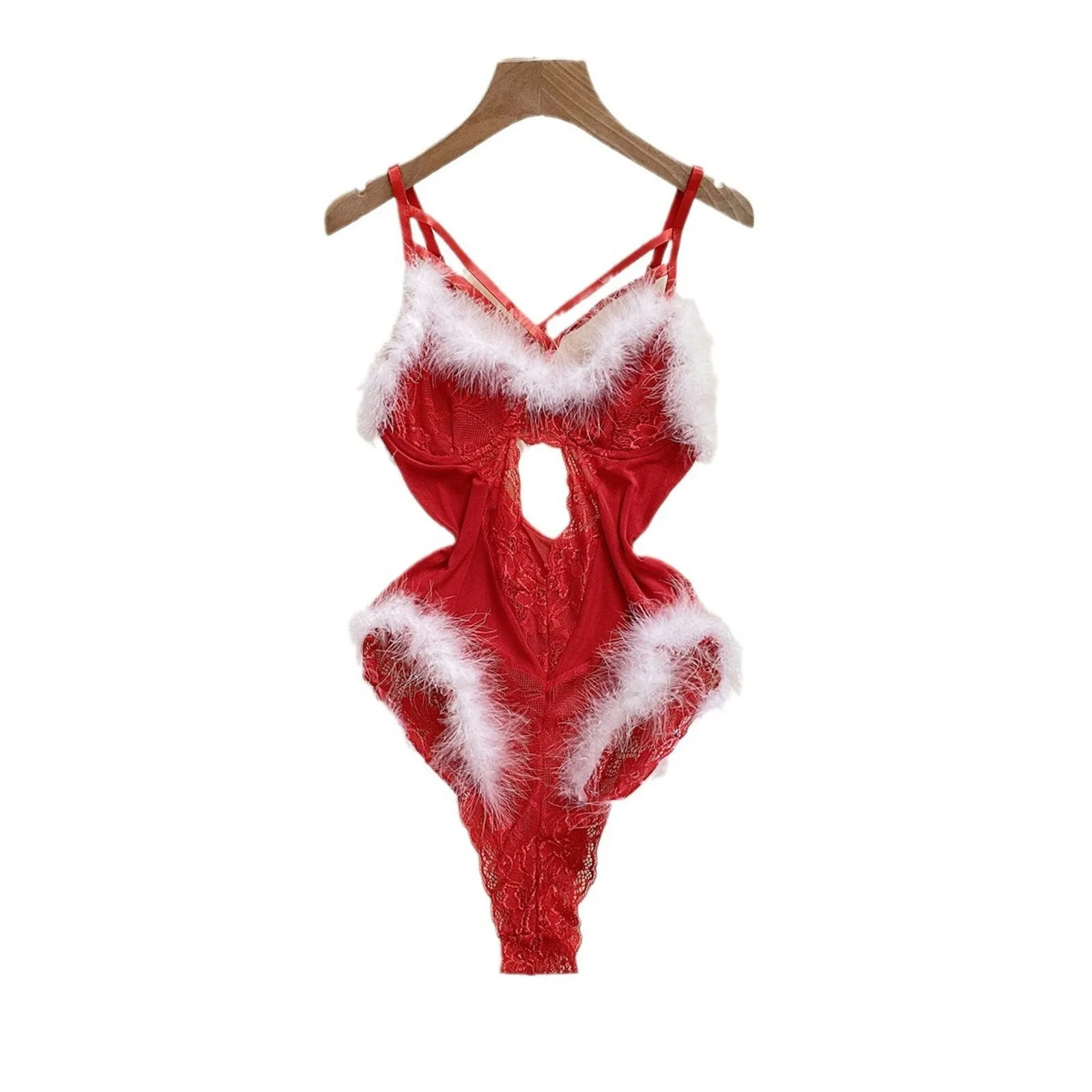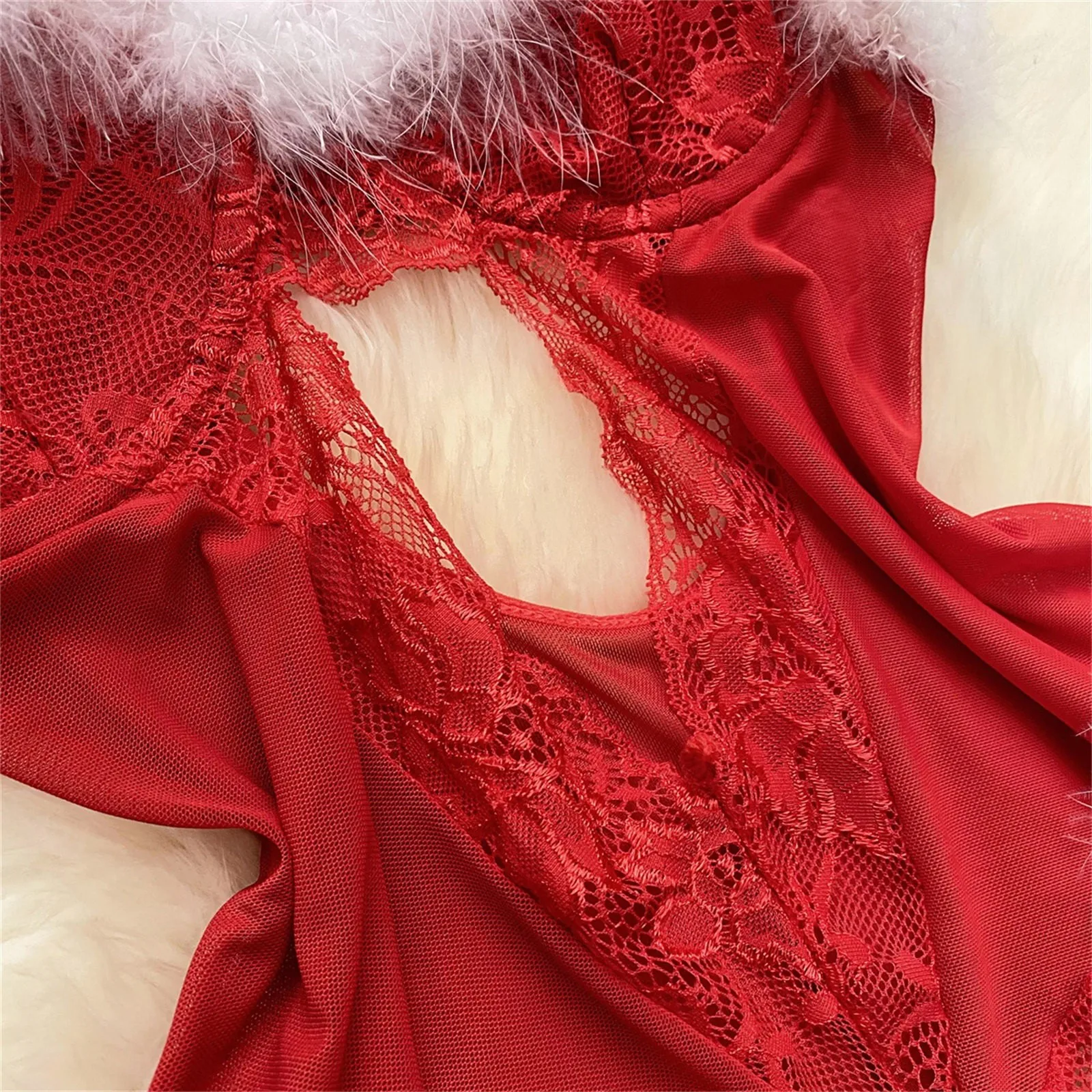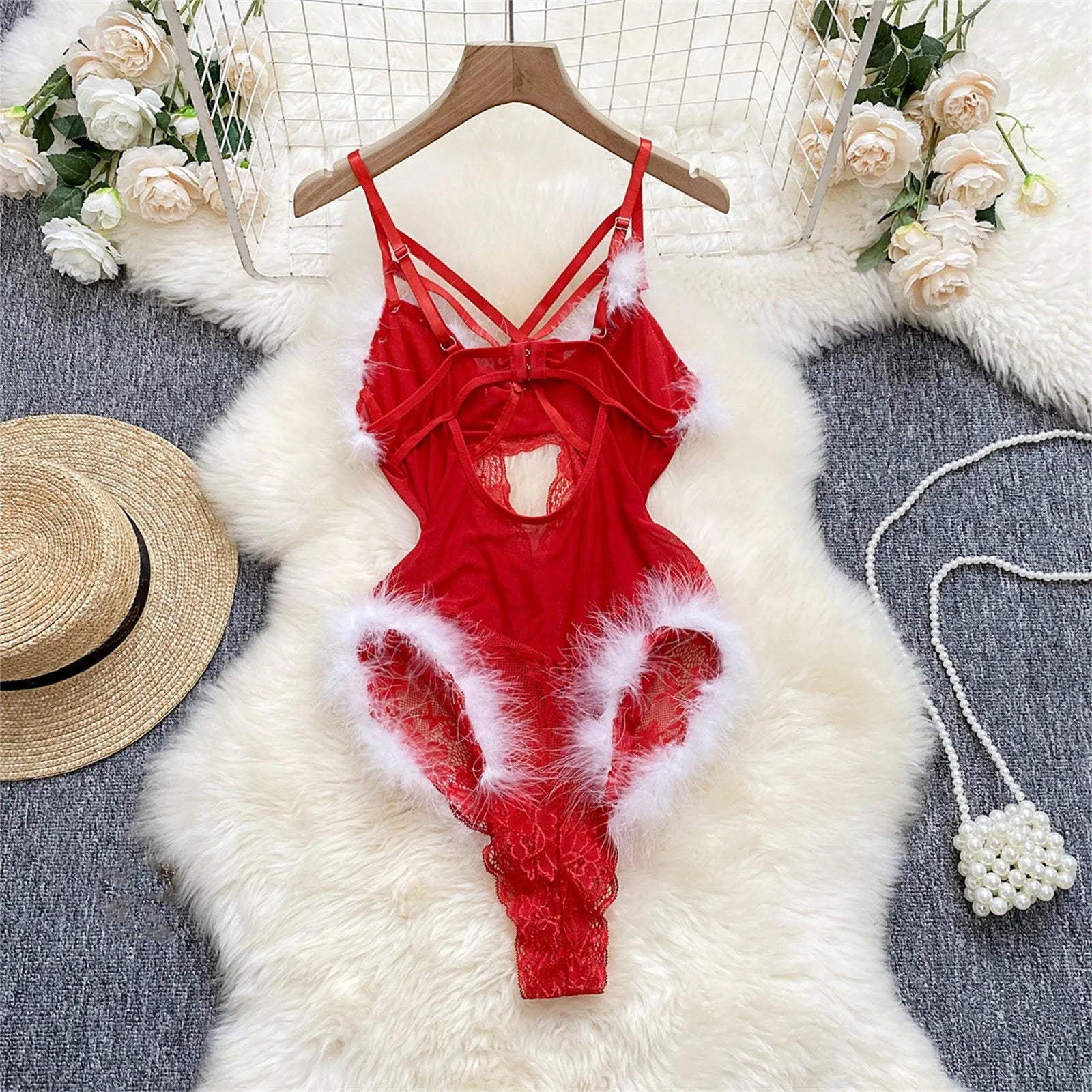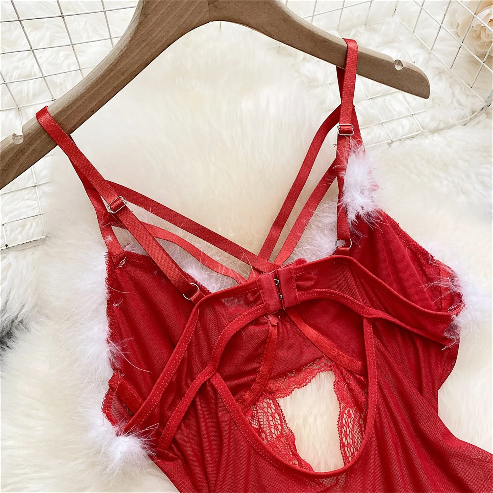 Women's Sexy Christmas Erotic Lingerie Furry With Steel Ring Lace Bodysuit Negligee Lingerie Секси Комплект Женского Белья