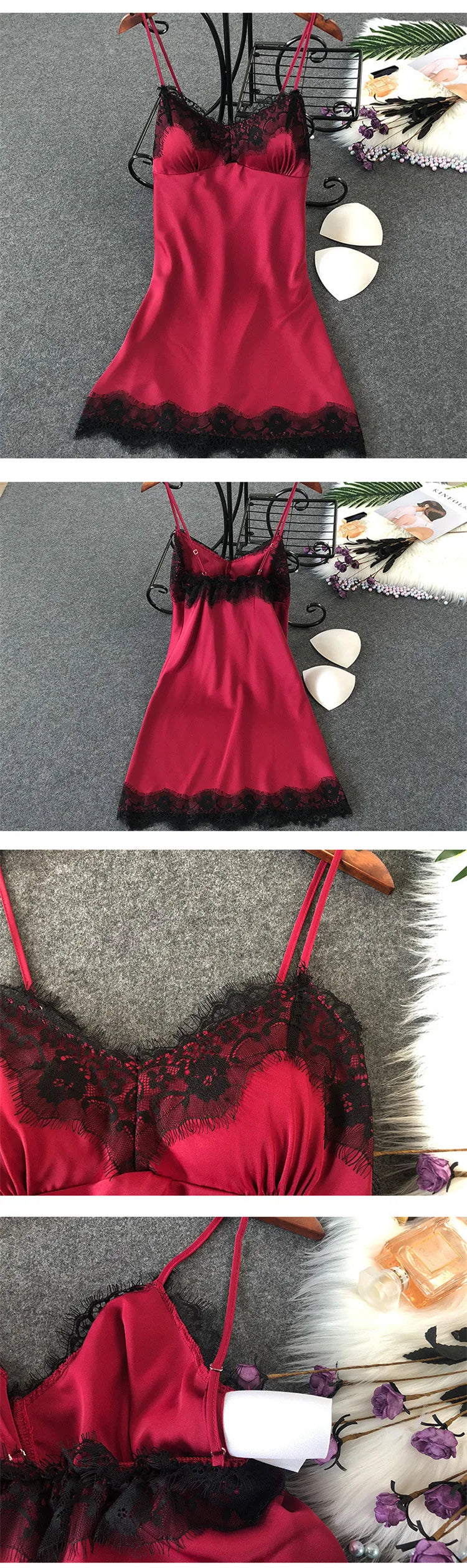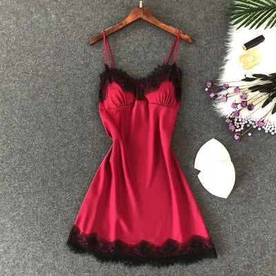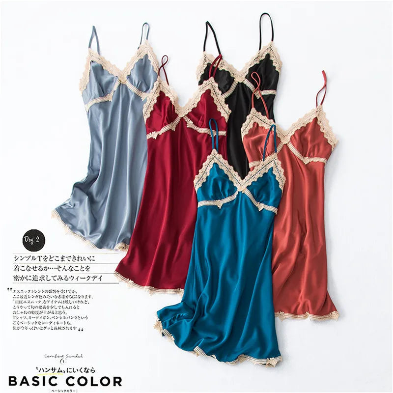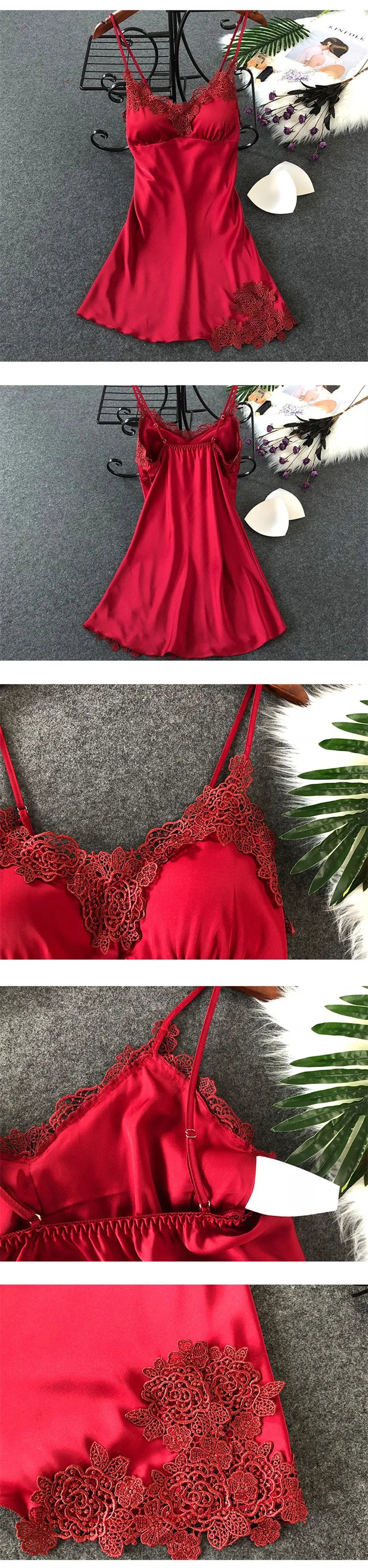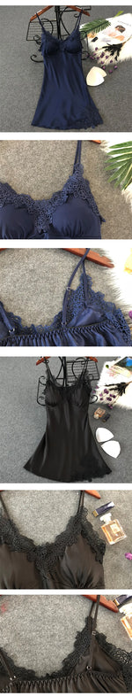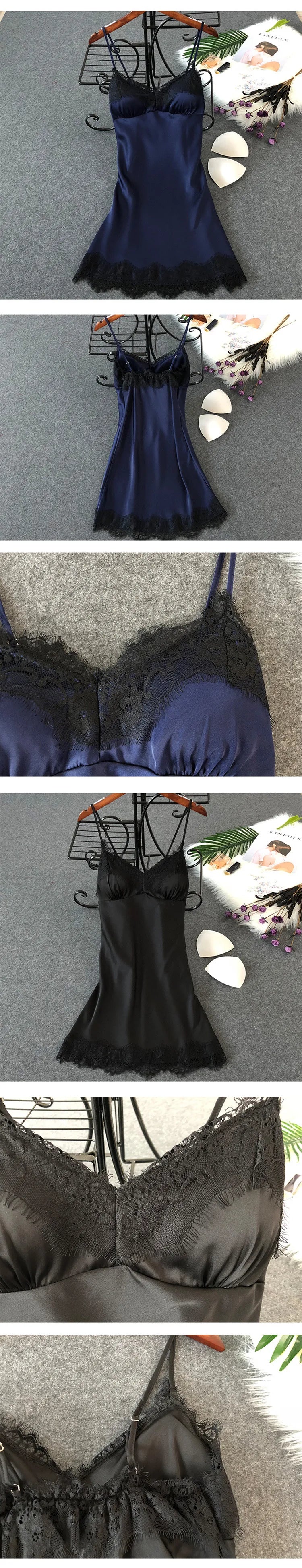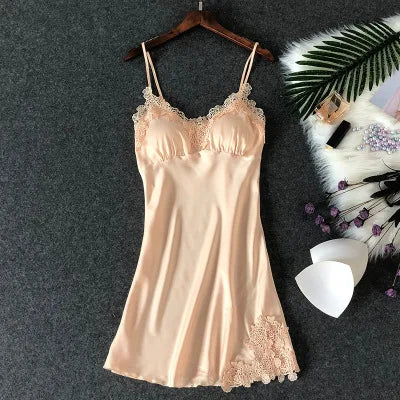 Women’s Silk Satin Lace-Trim Babydoll Nightgown with Chest Pad – Summer Sleep Chemise