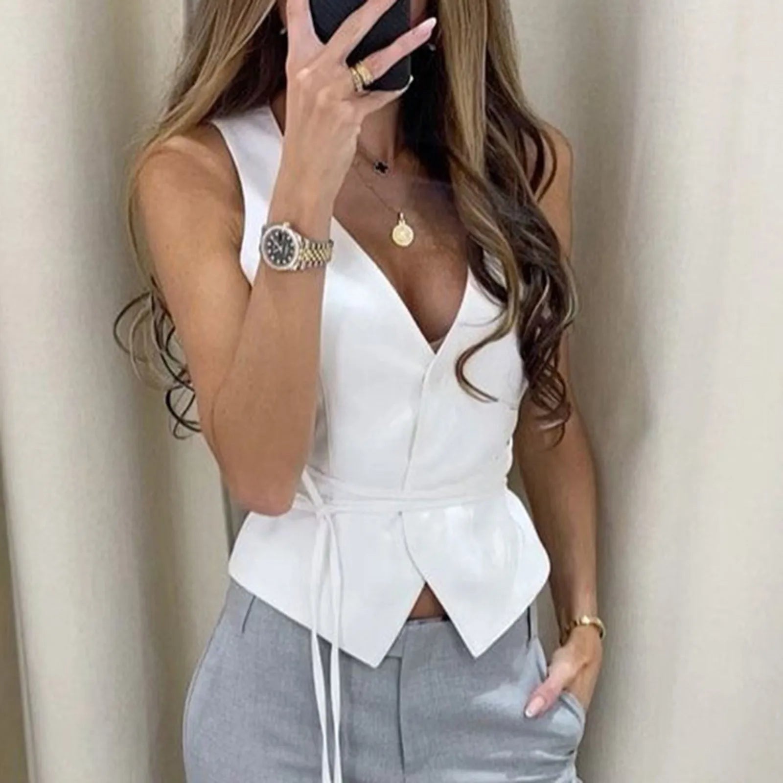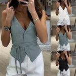 V-Neck Lace Up Slim Fit Tank Top – Sleeveless Y2K Cropped Camisole Cardigan for Women