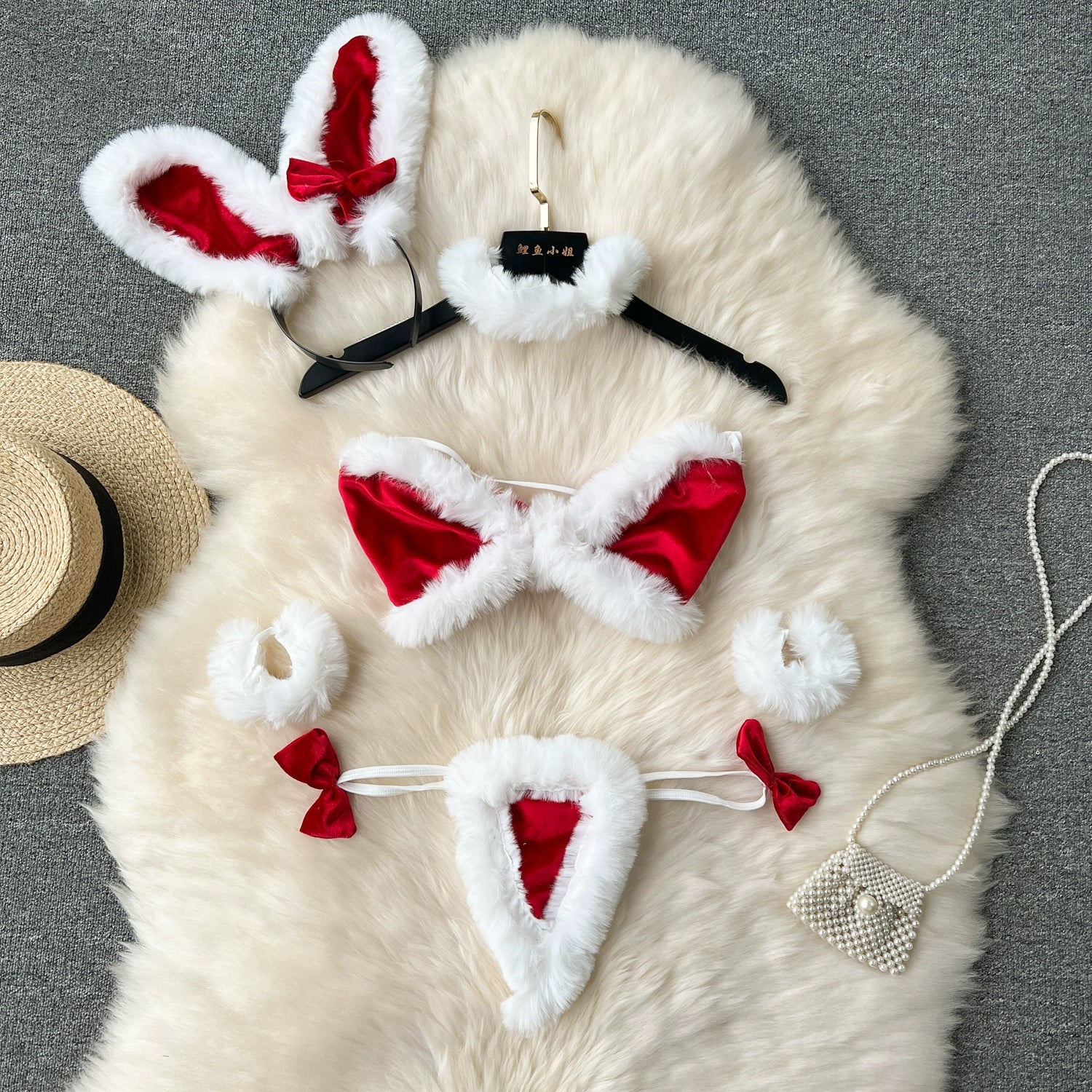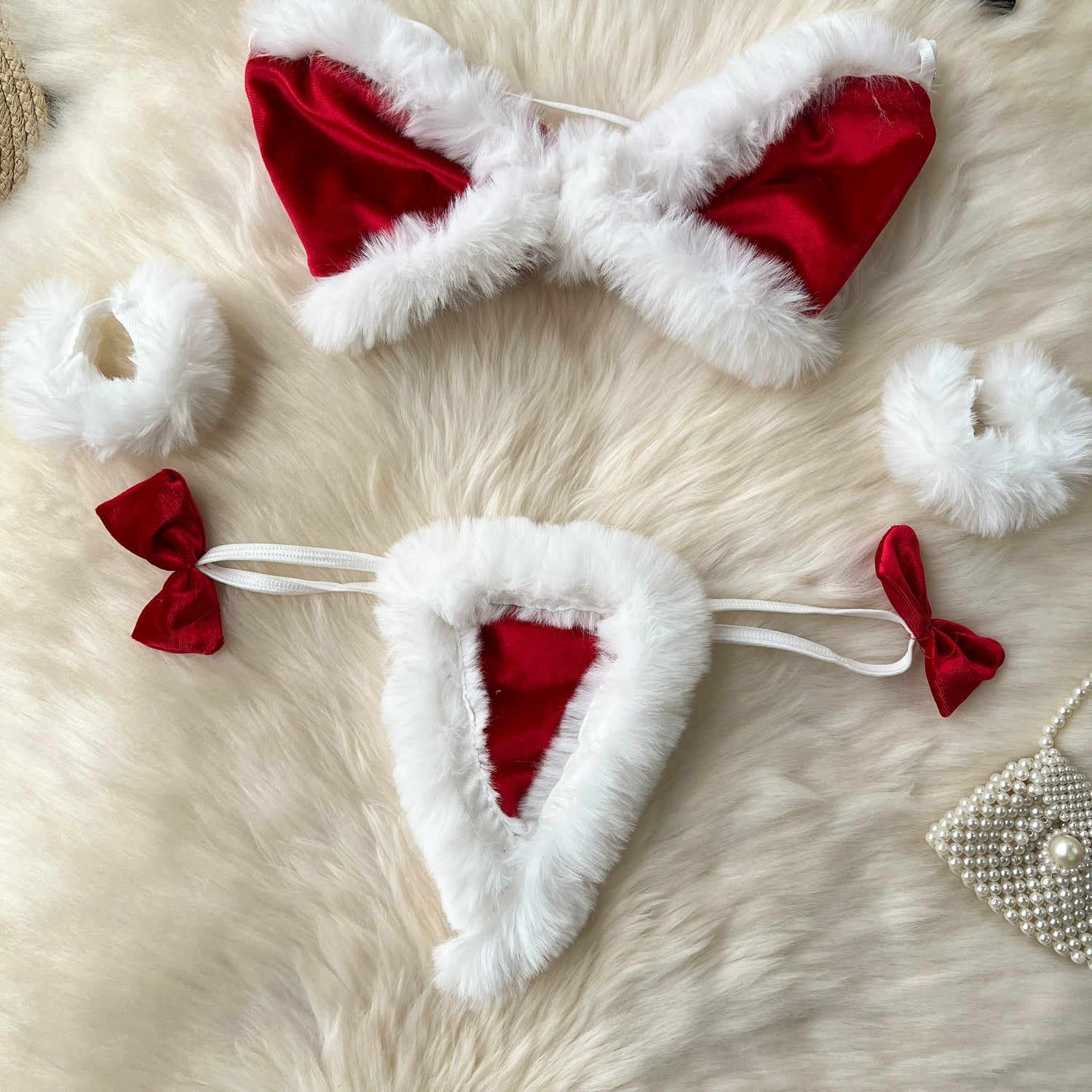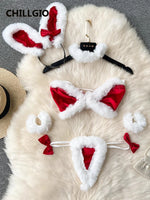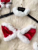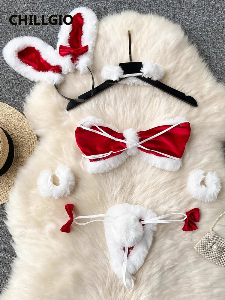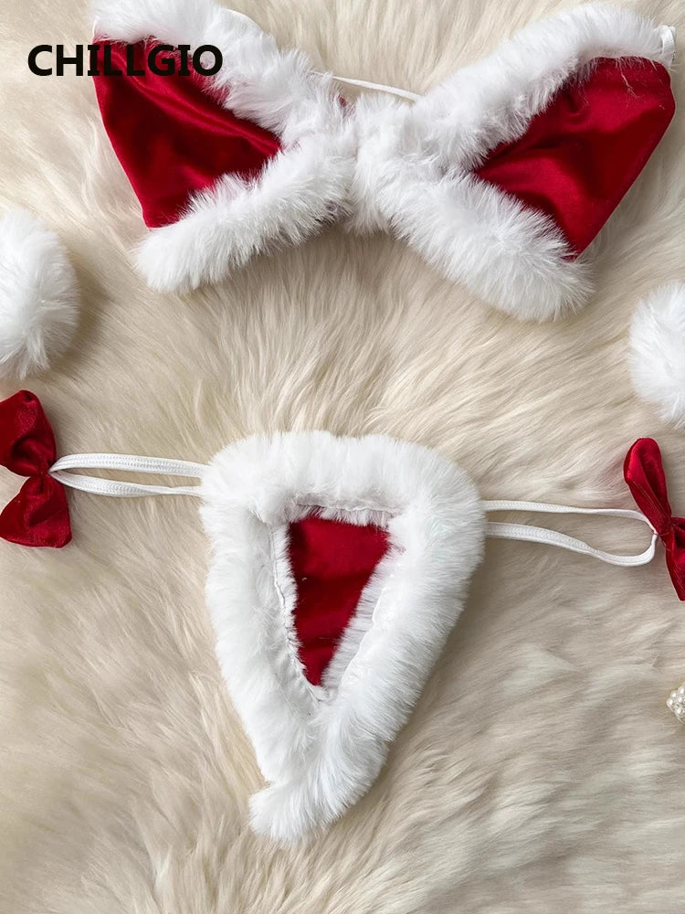 CHILLGIO Women Sexy Christmas Velour Bra Brief Suits Fashion Intimate Lingerie 5 Piece Erotic Bras Thongs Outfits Underwear Sets