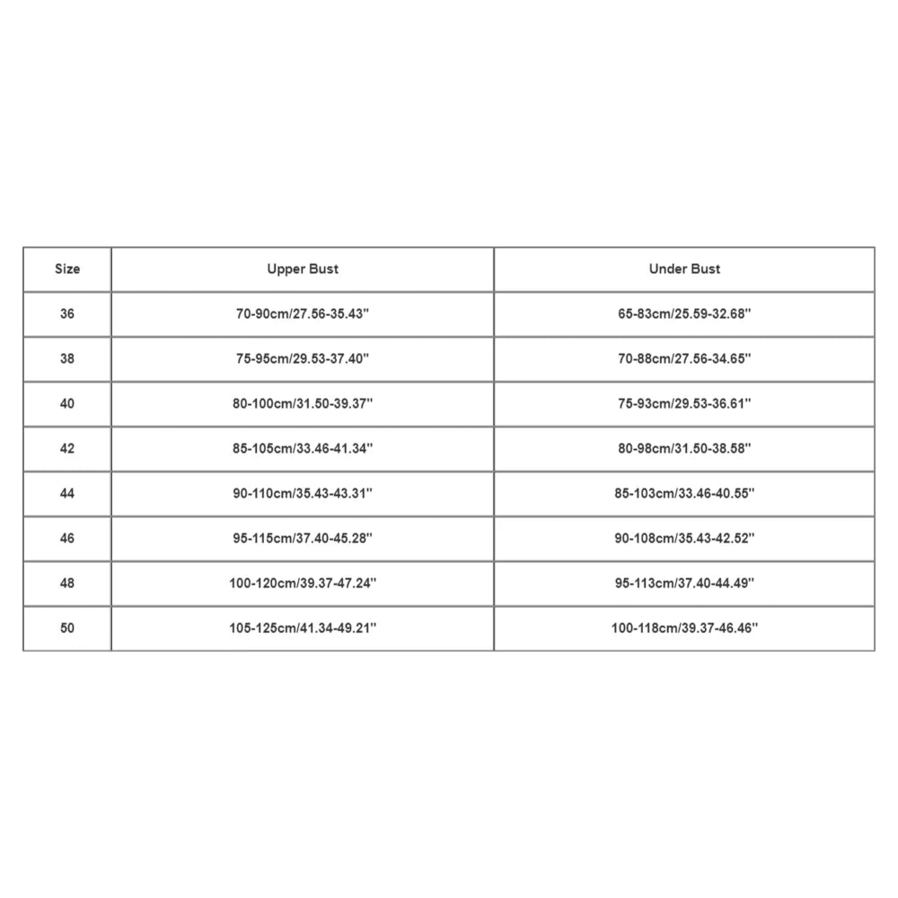 | Size:50 | Upper Bust:105-125cm/41.34-49.21'' | Under Bust:100-118cm/39.37-46.46'' |
