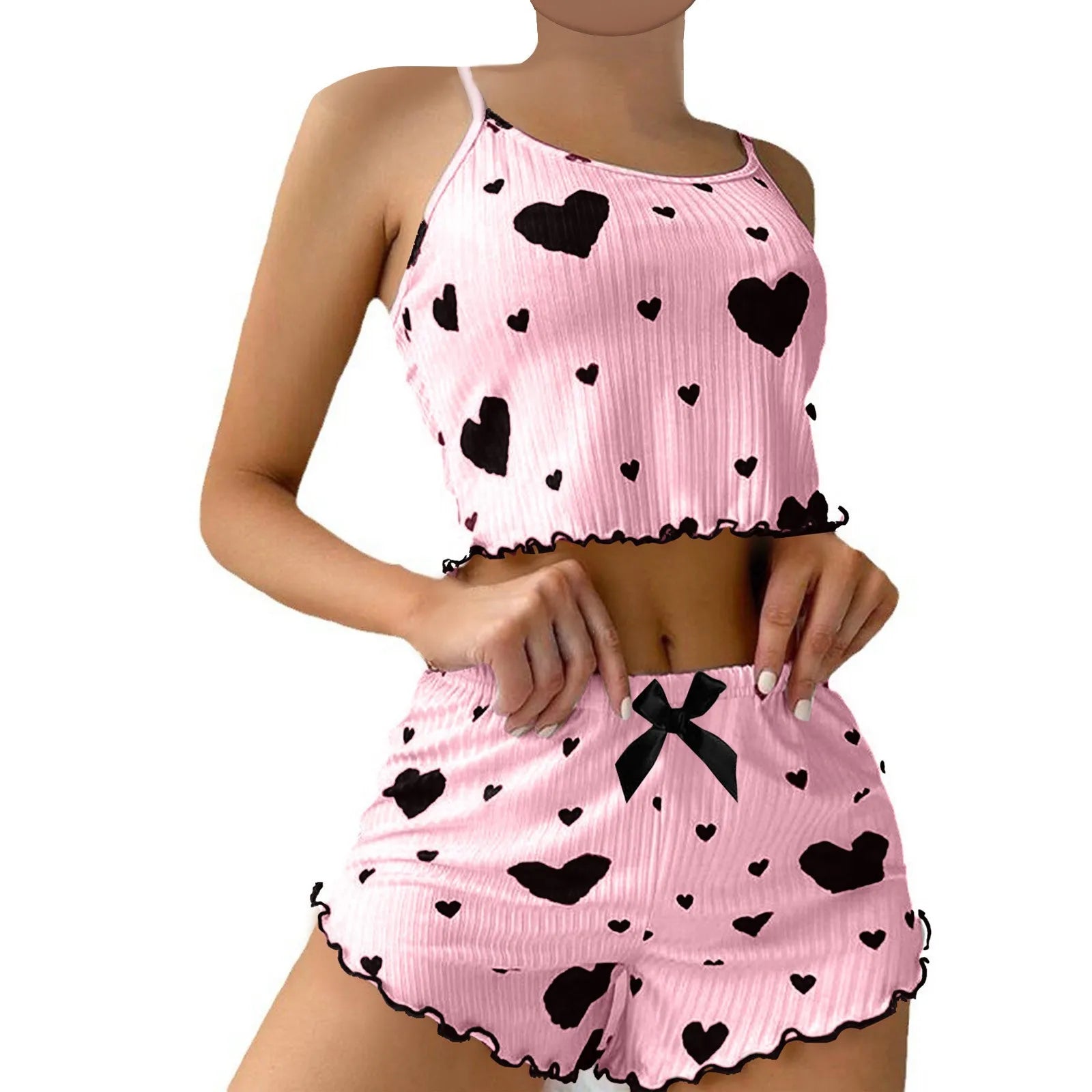 Heart Print Women's Pajamas Set Sleepwear 2 PCS Short Tank Tops and Shorts Sets Ventilate Soft Casual Love Sleeveless Home Suit