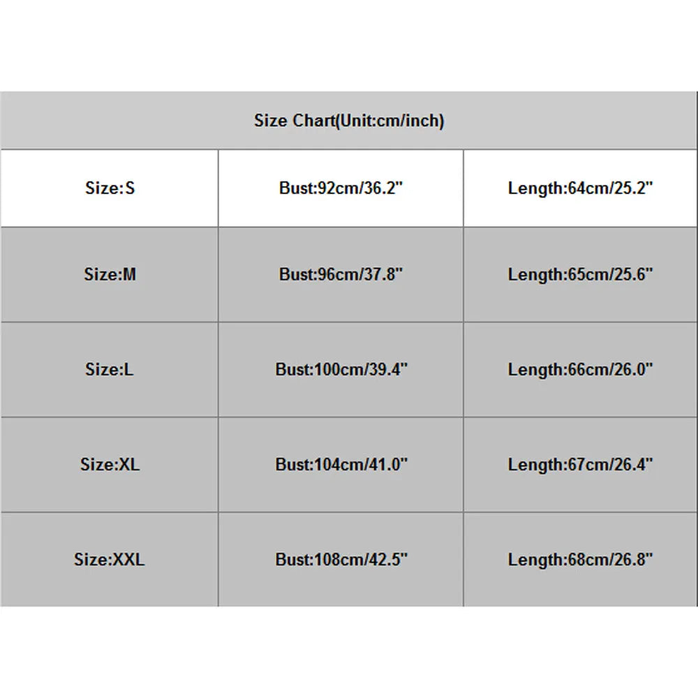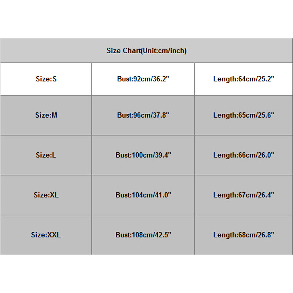 | Size:XXL | Bust:108cm/42.5'' | Length:68cm/26.8'' |
