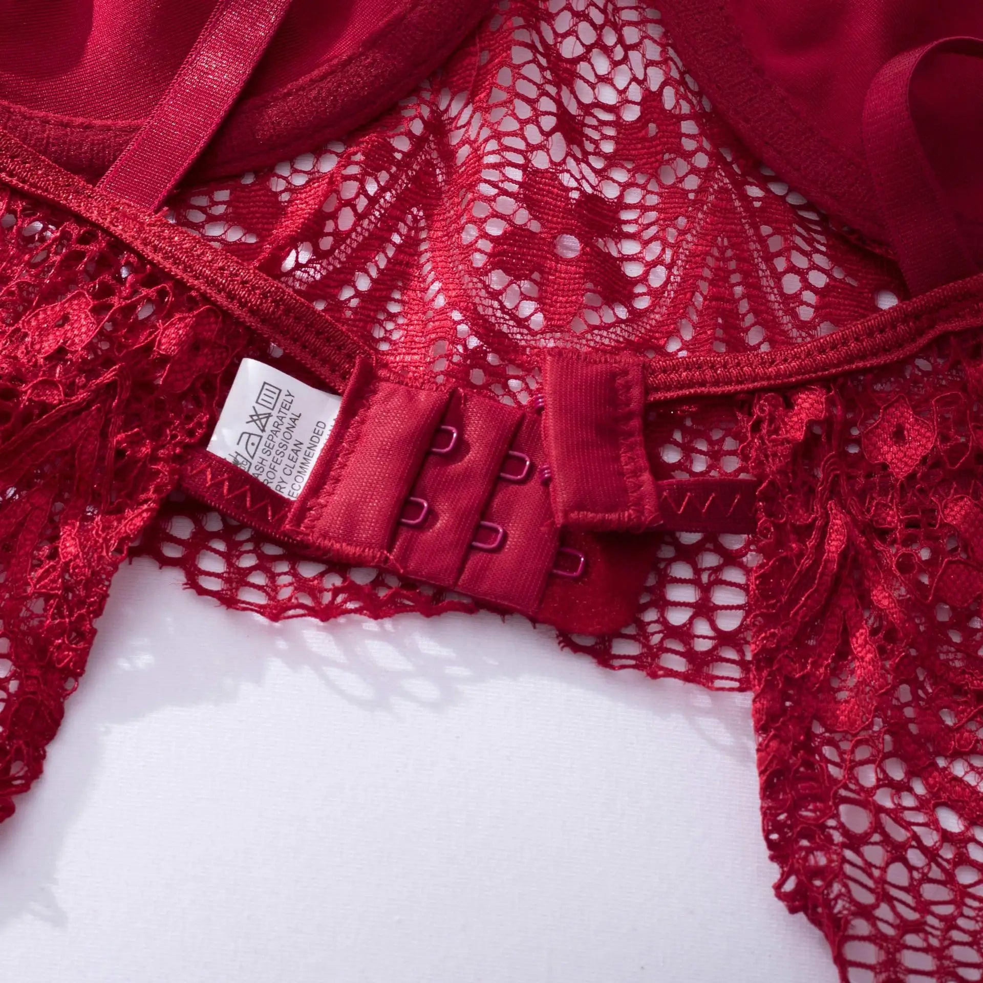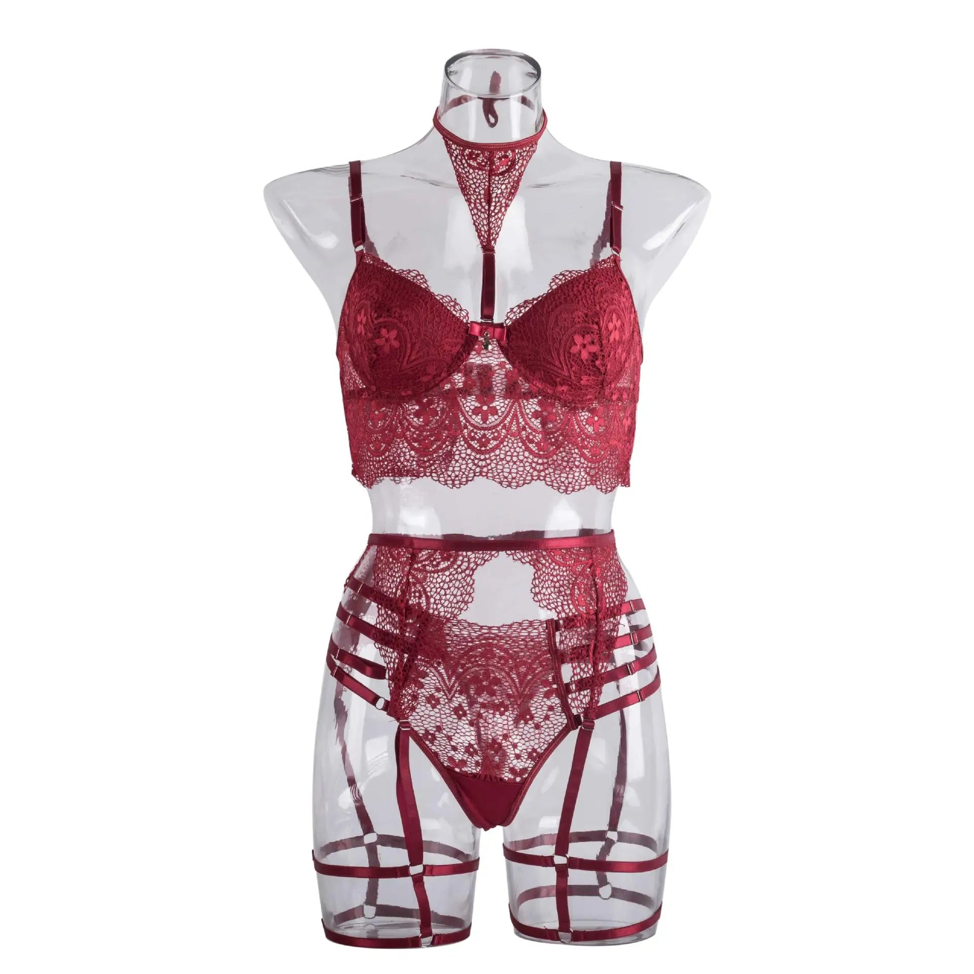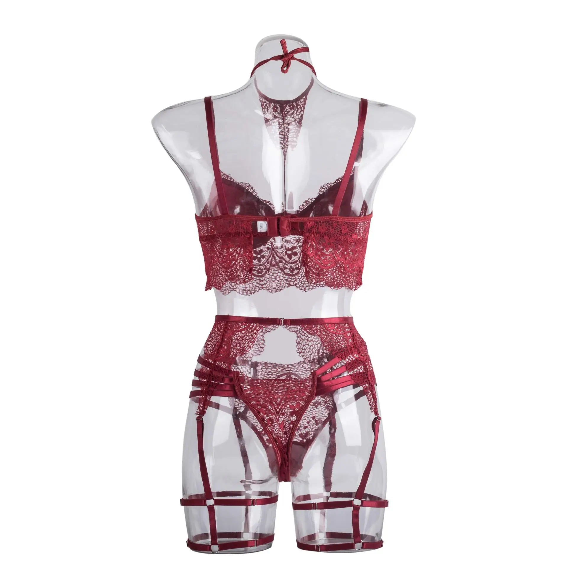 New burgundy hot gathering bra set sexy sheer lace eyelash halterneck bra thong detachable leg ring erotic lingerie