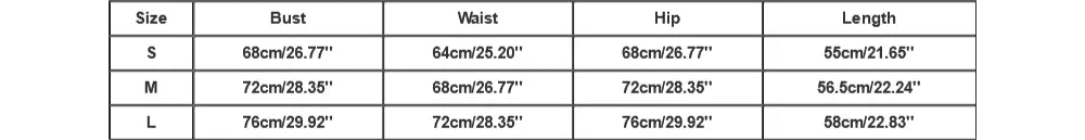 | Size:S | Bust:68cm/26.77'' | Waist:64cm/25.20'' | Hip:68cm/26.77'' | Length:55cm/21.65'' |