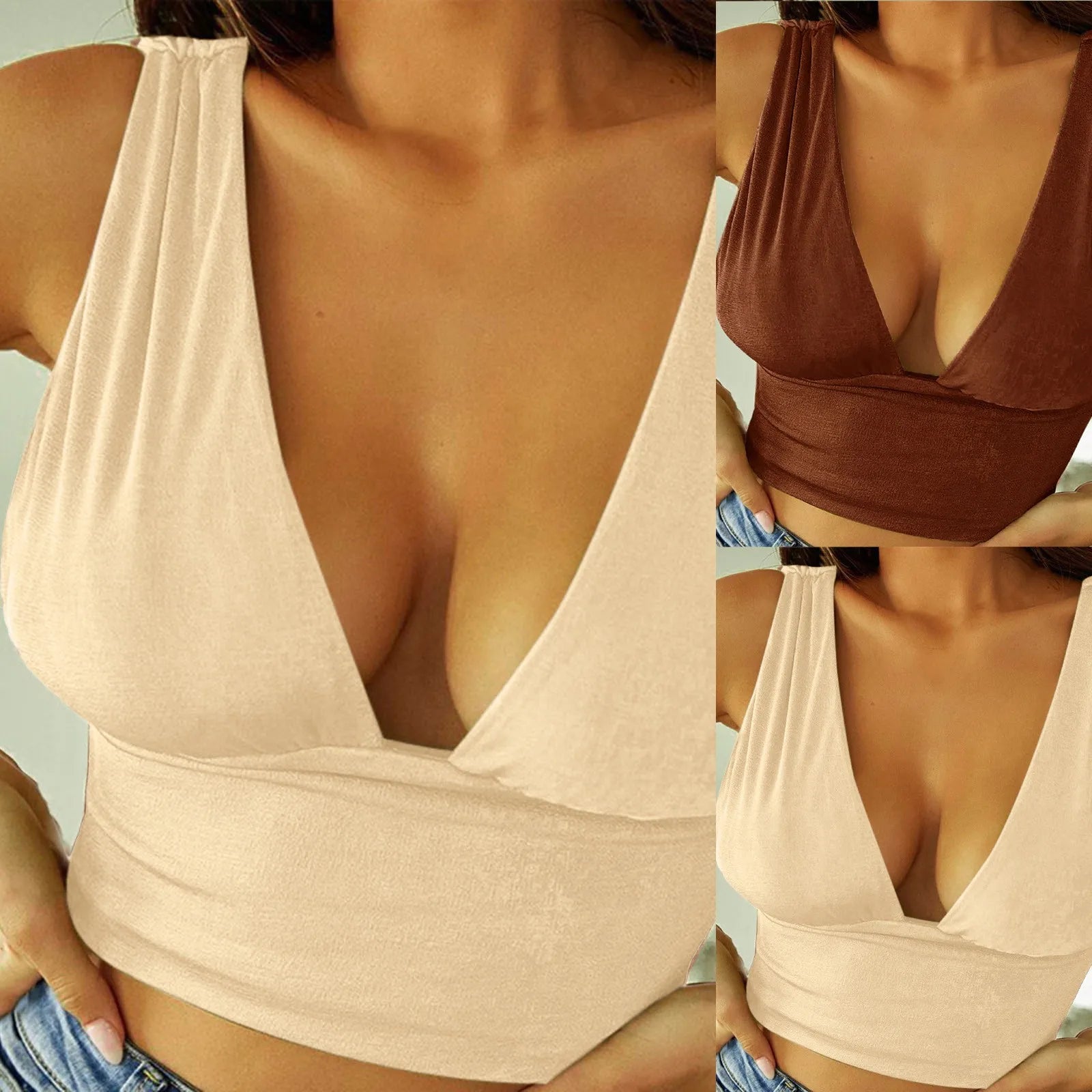 Sexy Deep V Crop Top Solid Color Sleeveless Shirt Tops Summer Casual Tank Tops Sexy Bra Vest Camisole Tee Women's Shirts Tops
