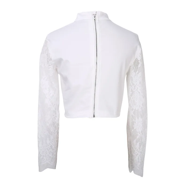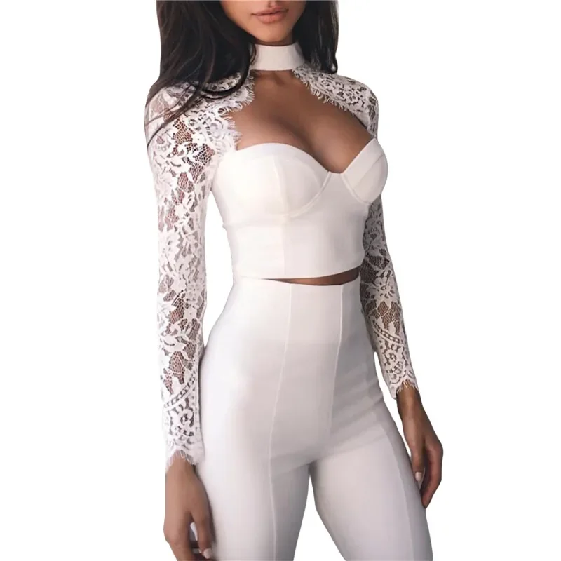 Sexy Lace Patchwork Tops For Women Long Sleeve Push Up See-through Crop Tops Ladies Summer Spring Low-cut Slim Blouses