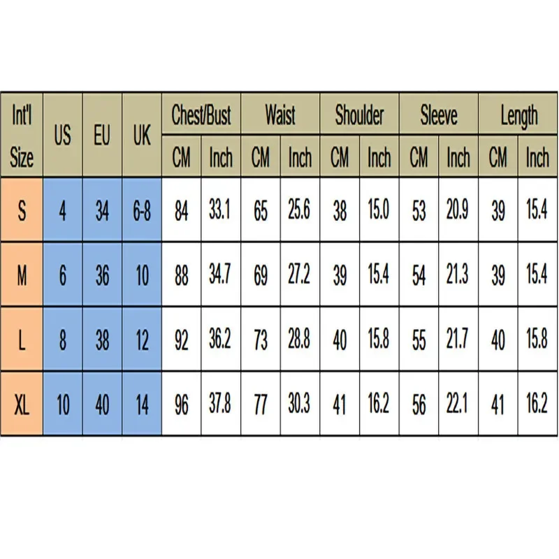 S Bust: 33.1 Waist: 25.6 Shoulder: 15.0 Sleeve: 20.9 Length: 15.4
