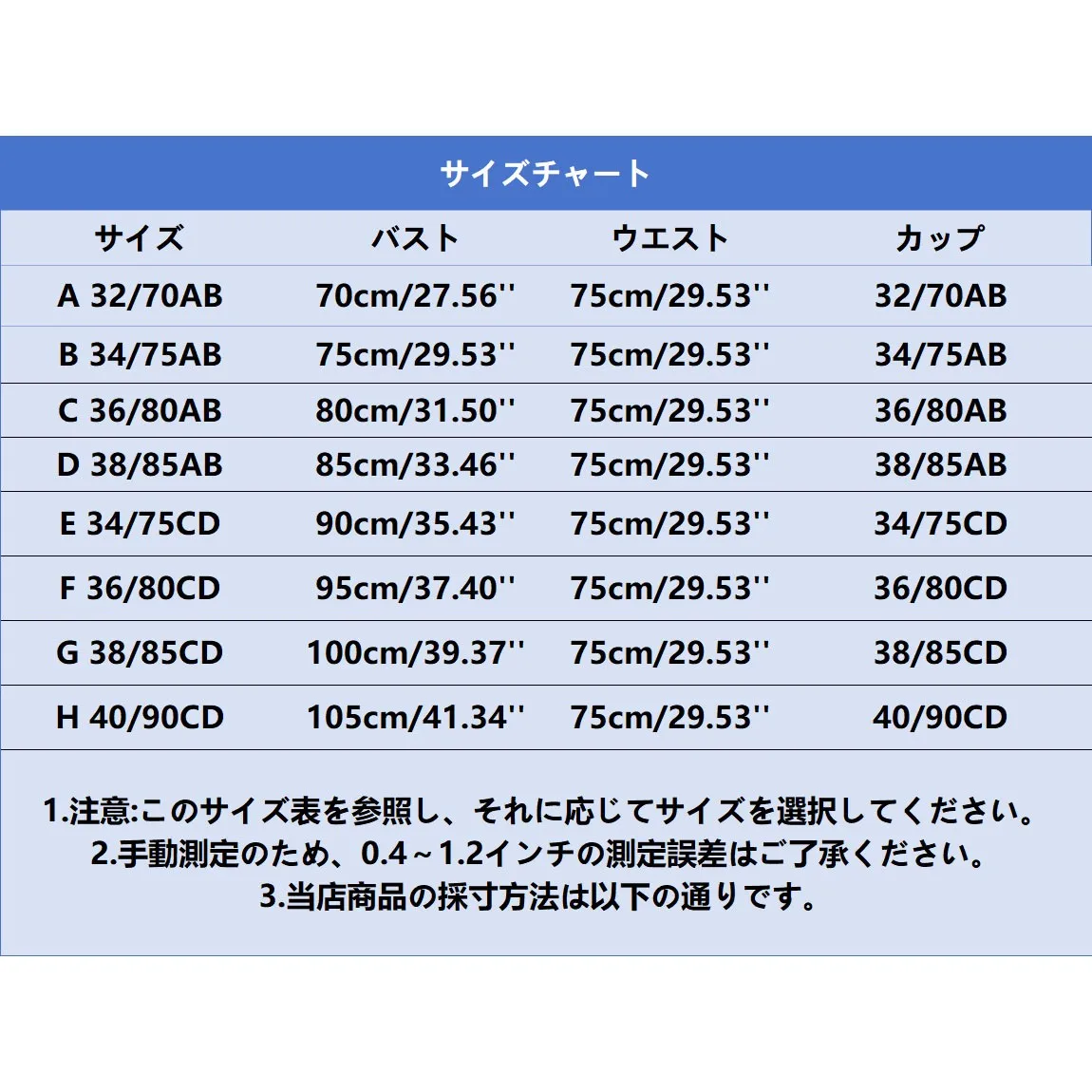 | Size:H 40/90CD | Bust:105cm/41.34'' | Waist:75cm/29.53'' | Cup:40/90CD |