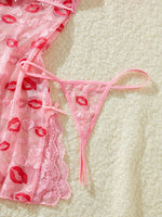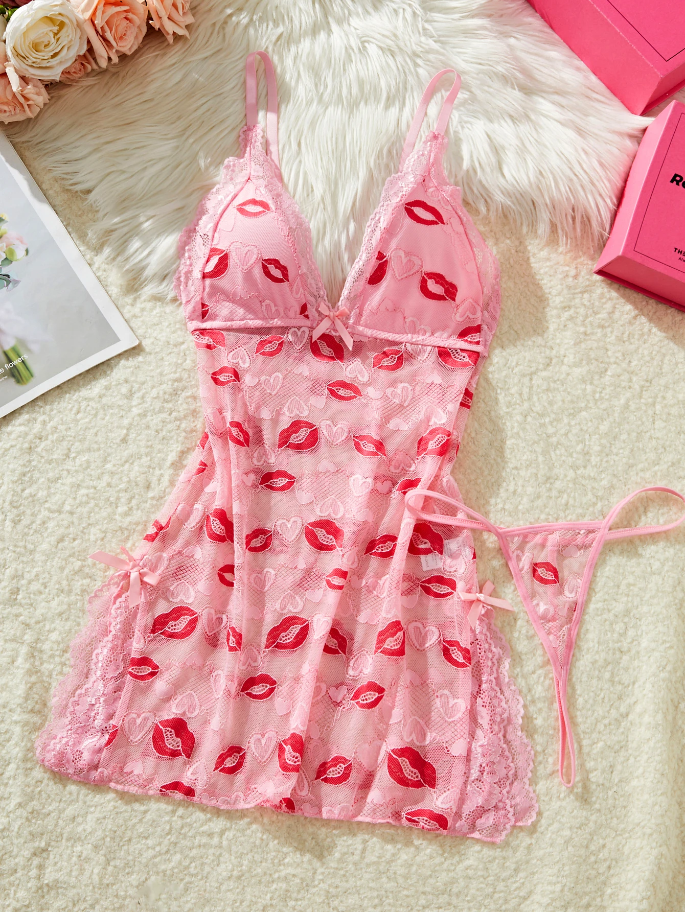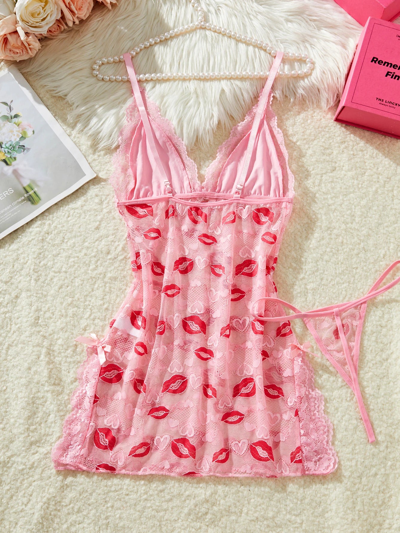 Women Pink Lips Love Print Nightdress Sexy Lace Bow Adult Dress Babydoll Sex Sleepdress And Thongs Lingerie Sets Erotic Outfits
