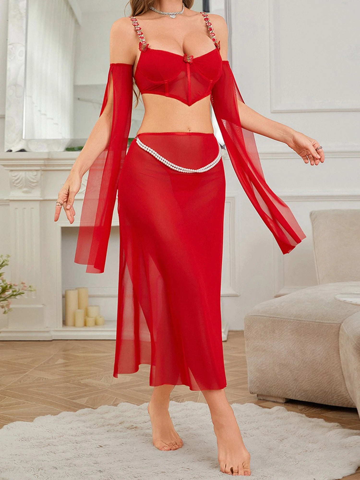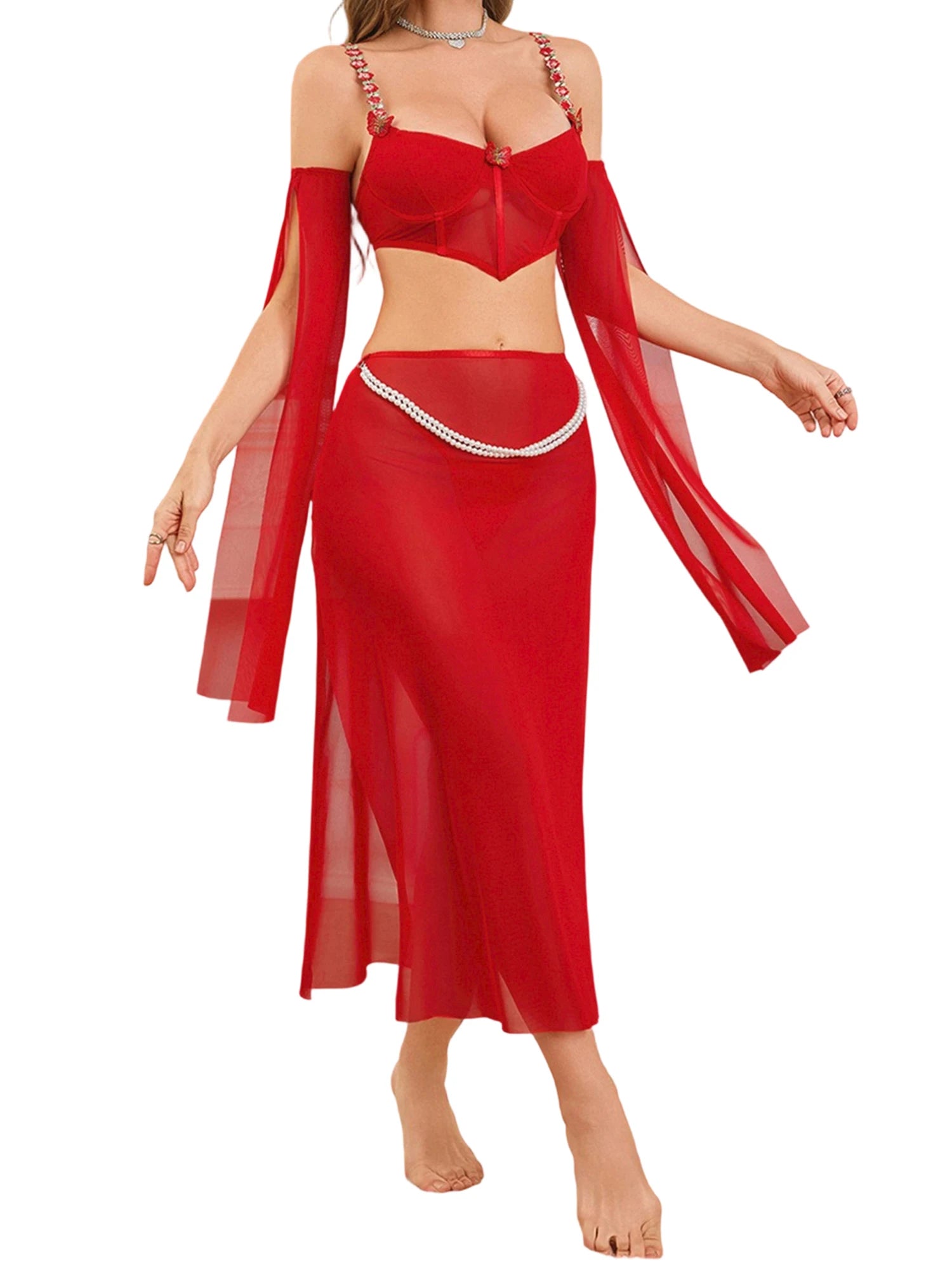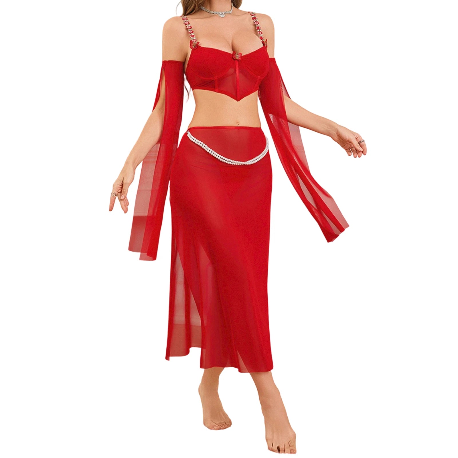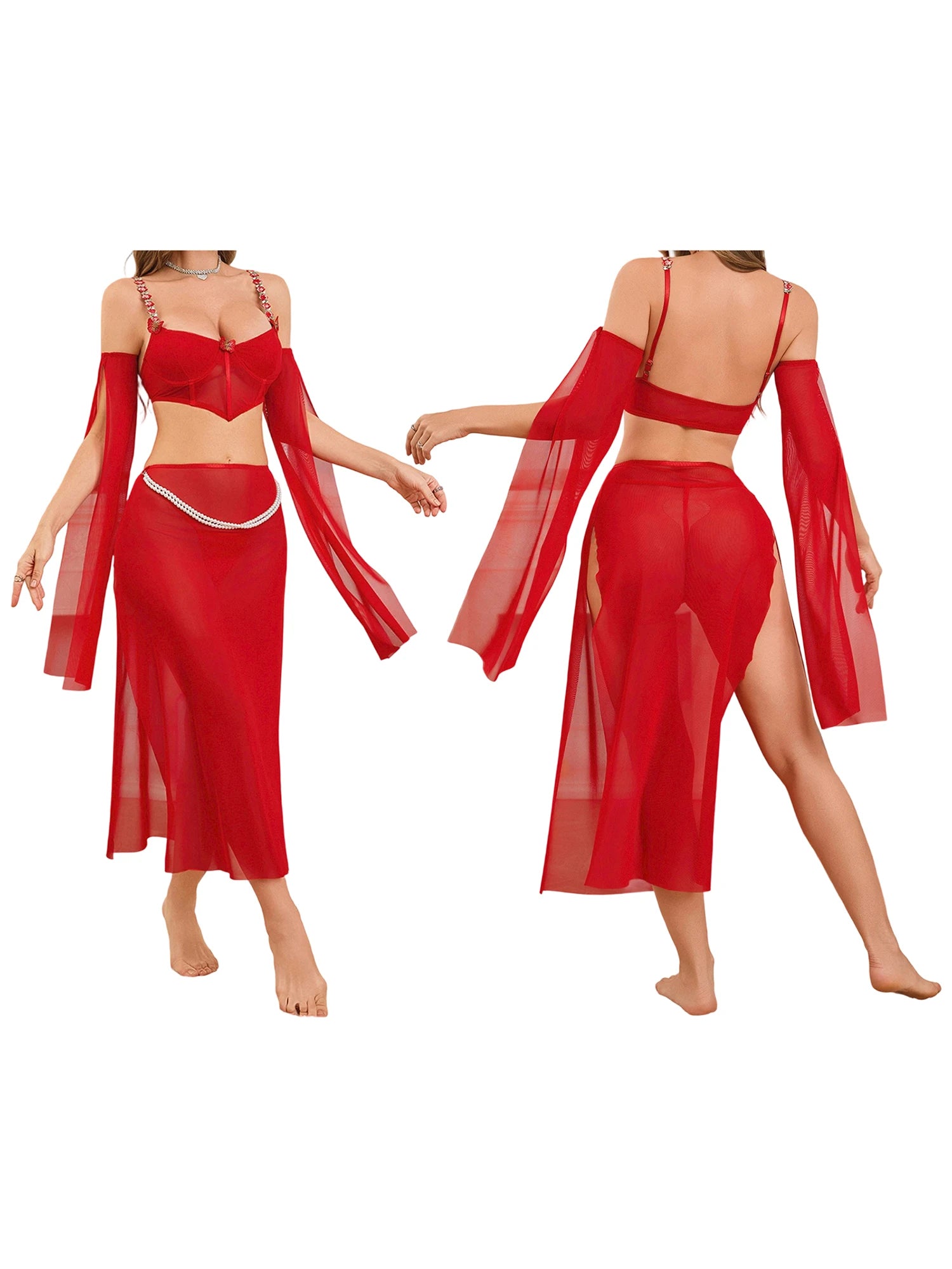 Women's 5 Piece Cosplay Lingerie Set Corset Tops and Panty Set with Split Sleeves Skirt Set Dancer OutfitFeatures: