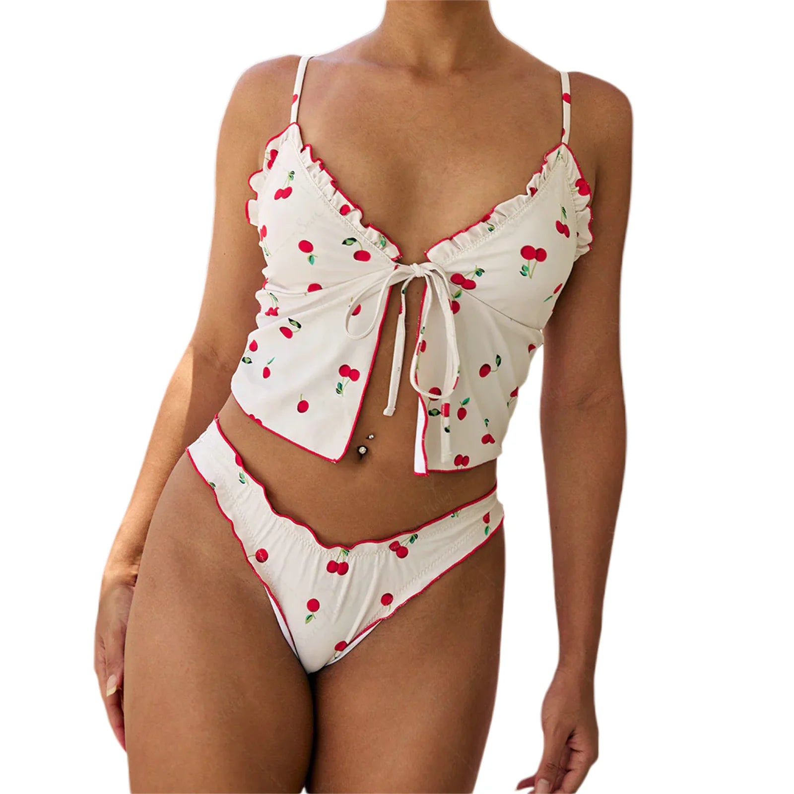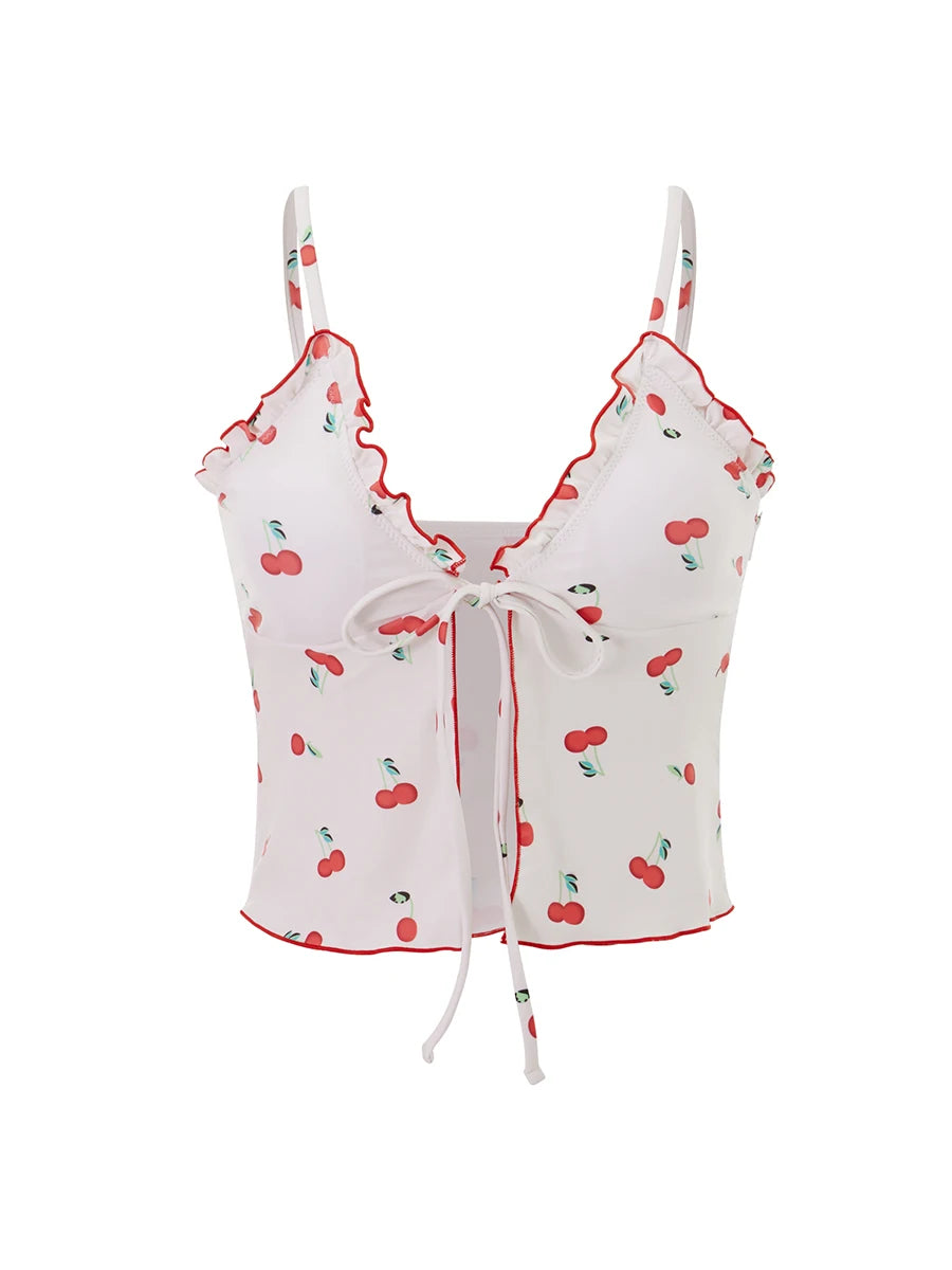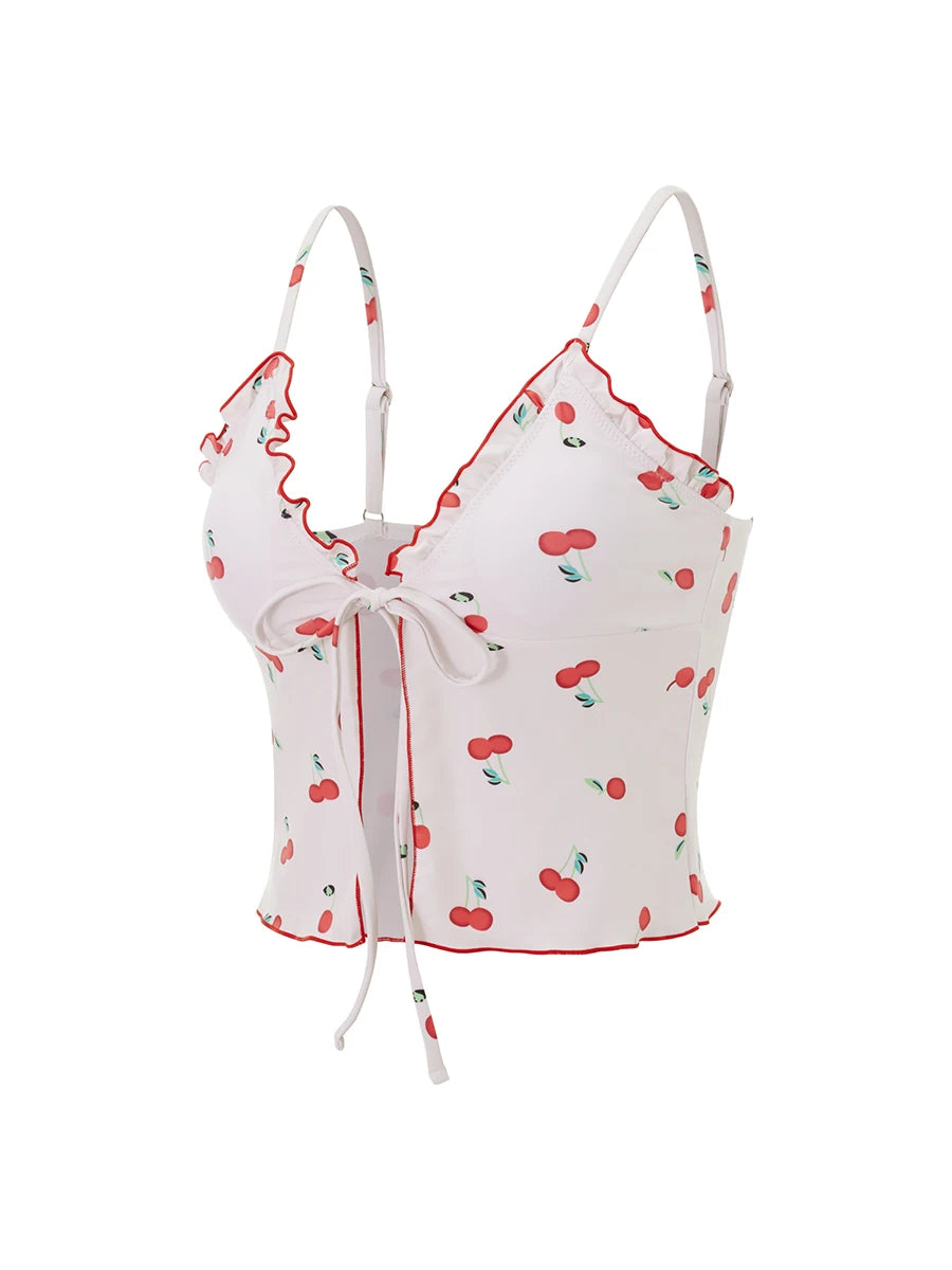 Crop bikini tops for women with cherry print, spaghetti straps and sleeveless, V-neckline, tie front, split hem; Eye-catching design makes you look more attractive and creates a look