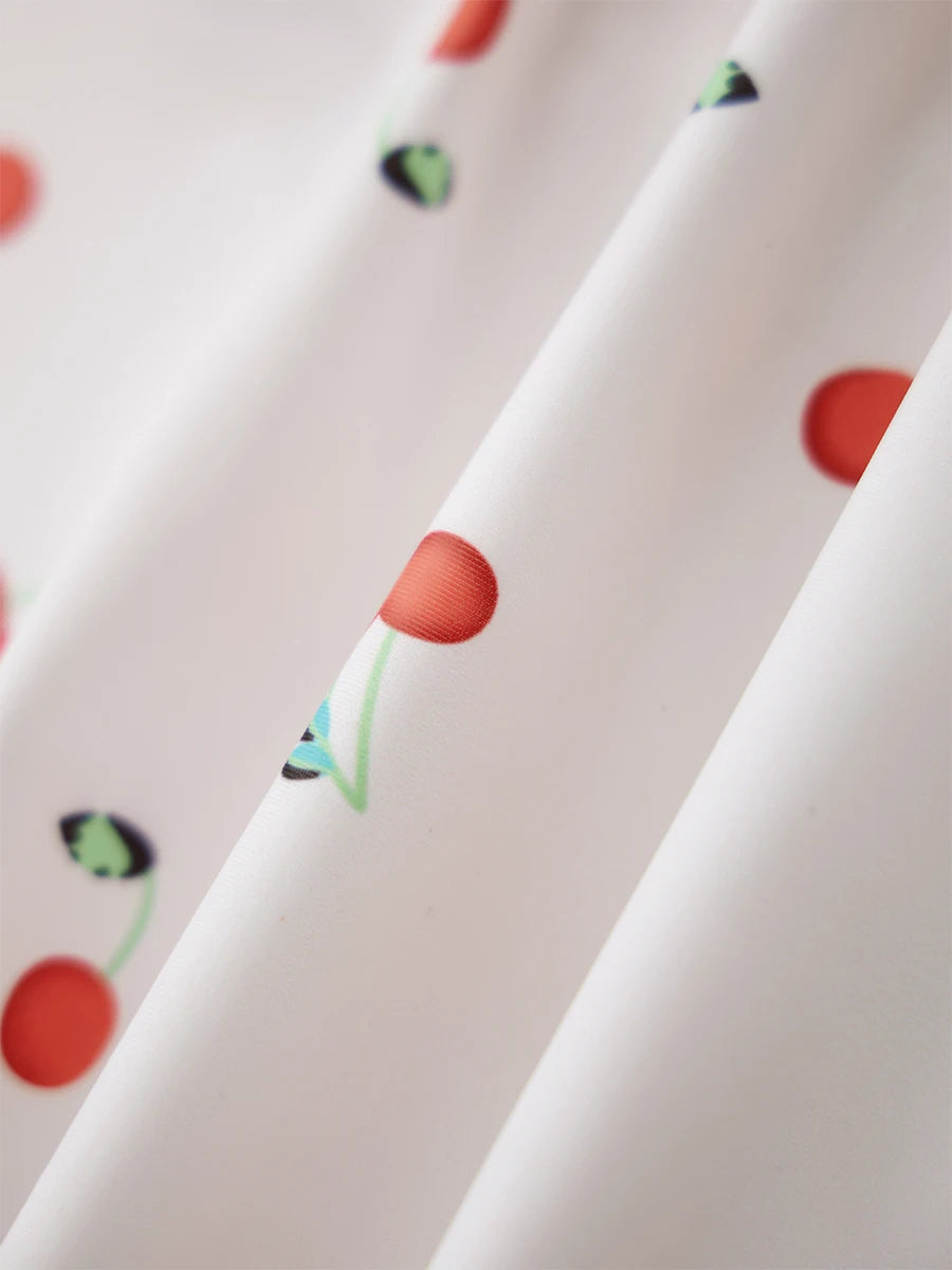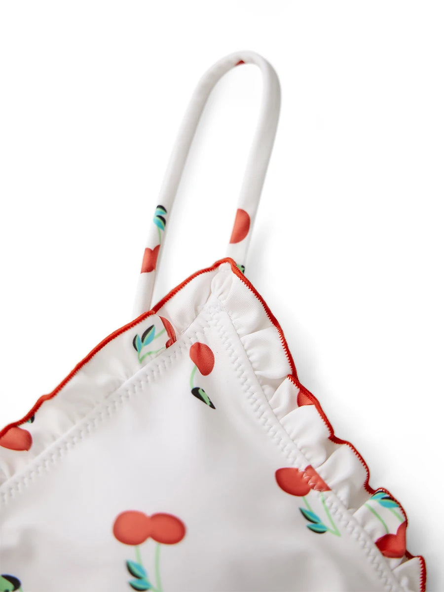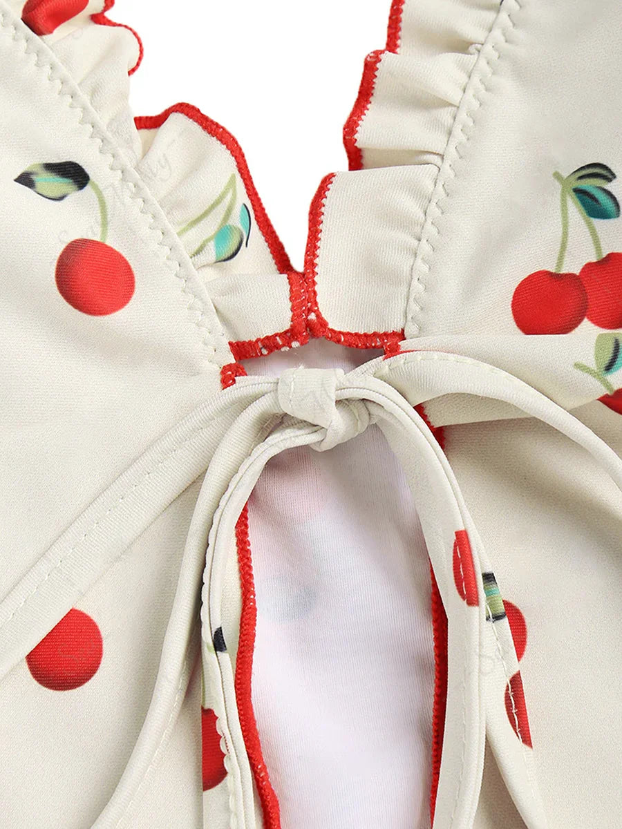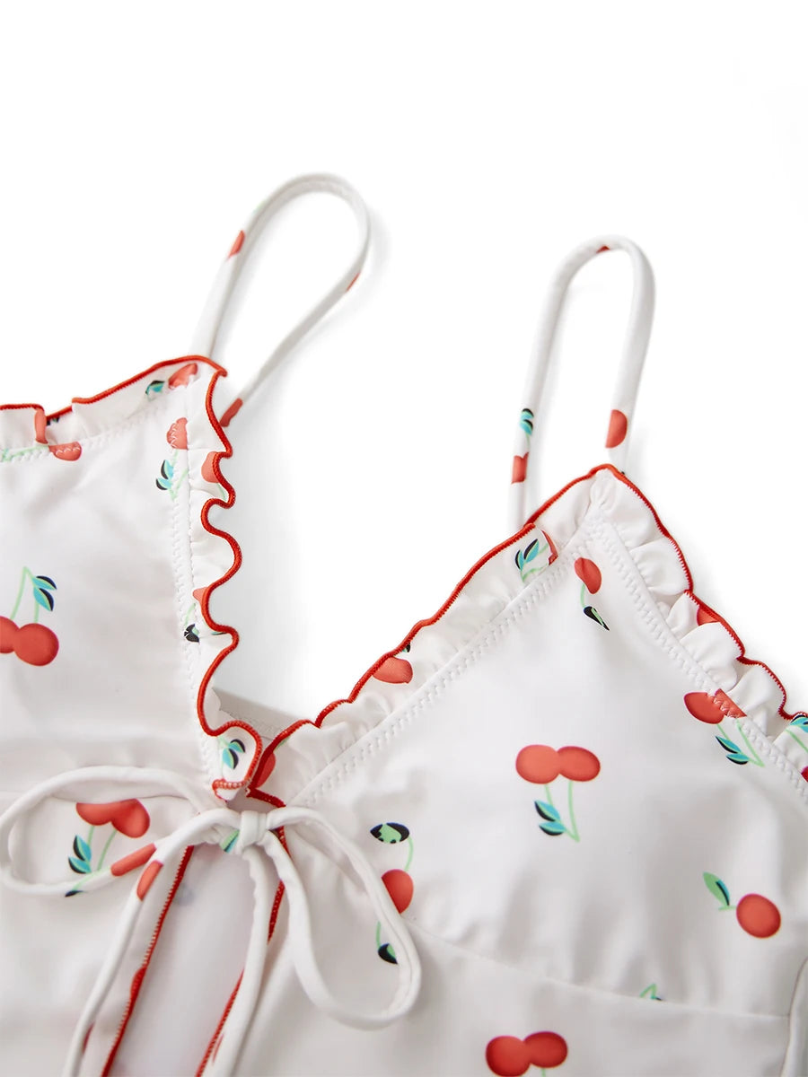 Crop bikini tops for women with cherry print, spaghetti straps and sleeveless, V-neckline, tie front, split hem; Eye-catching design makes you look more attractive and creates a look