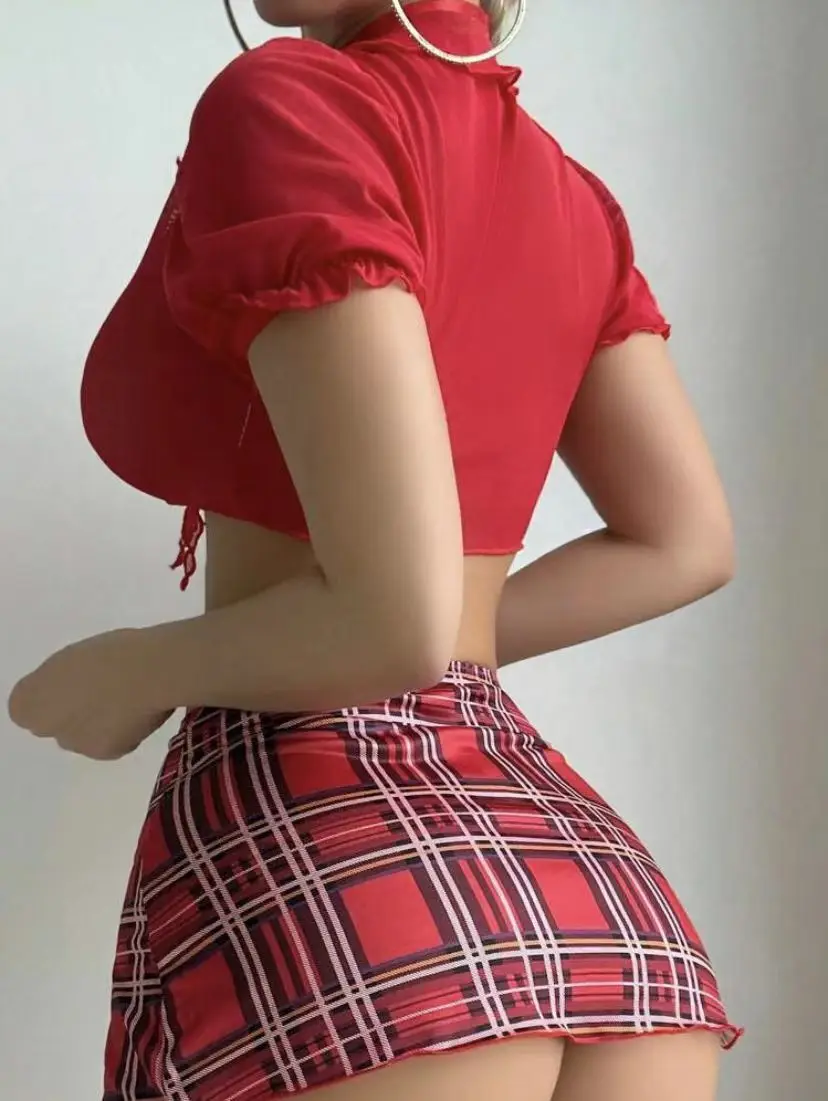 Women Lingerie Set, Short Sleeve Crop Top with Slit Plaid Skirt and Briefs Neck Tie Underwear SetThis lingerie set boosts your charm and self-confidence in front of your lover, lets you become more charming, and have a special night.