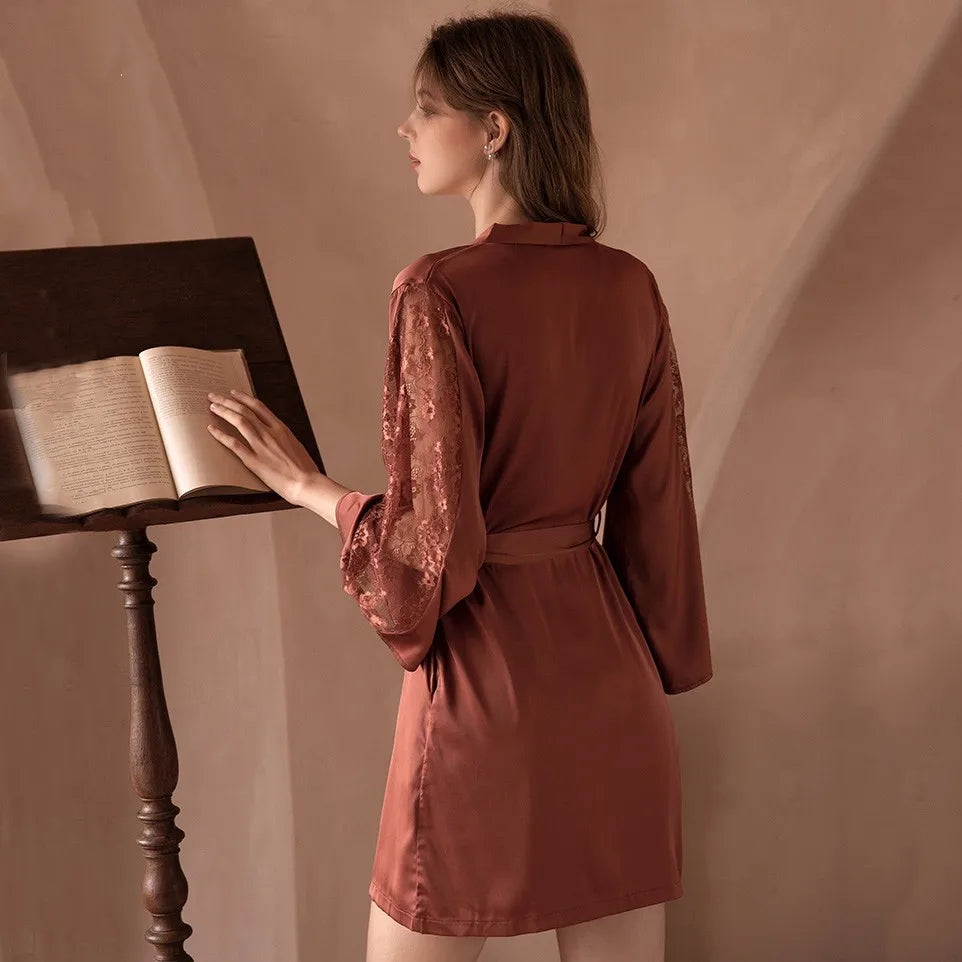 Women Sexy Robe Set Sleepwear Faux Silk Kimono Gown Lacee Lingerie Nightdress Soft Perspective Bridal Wedding Gift