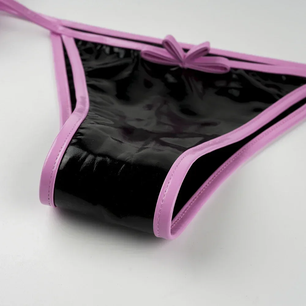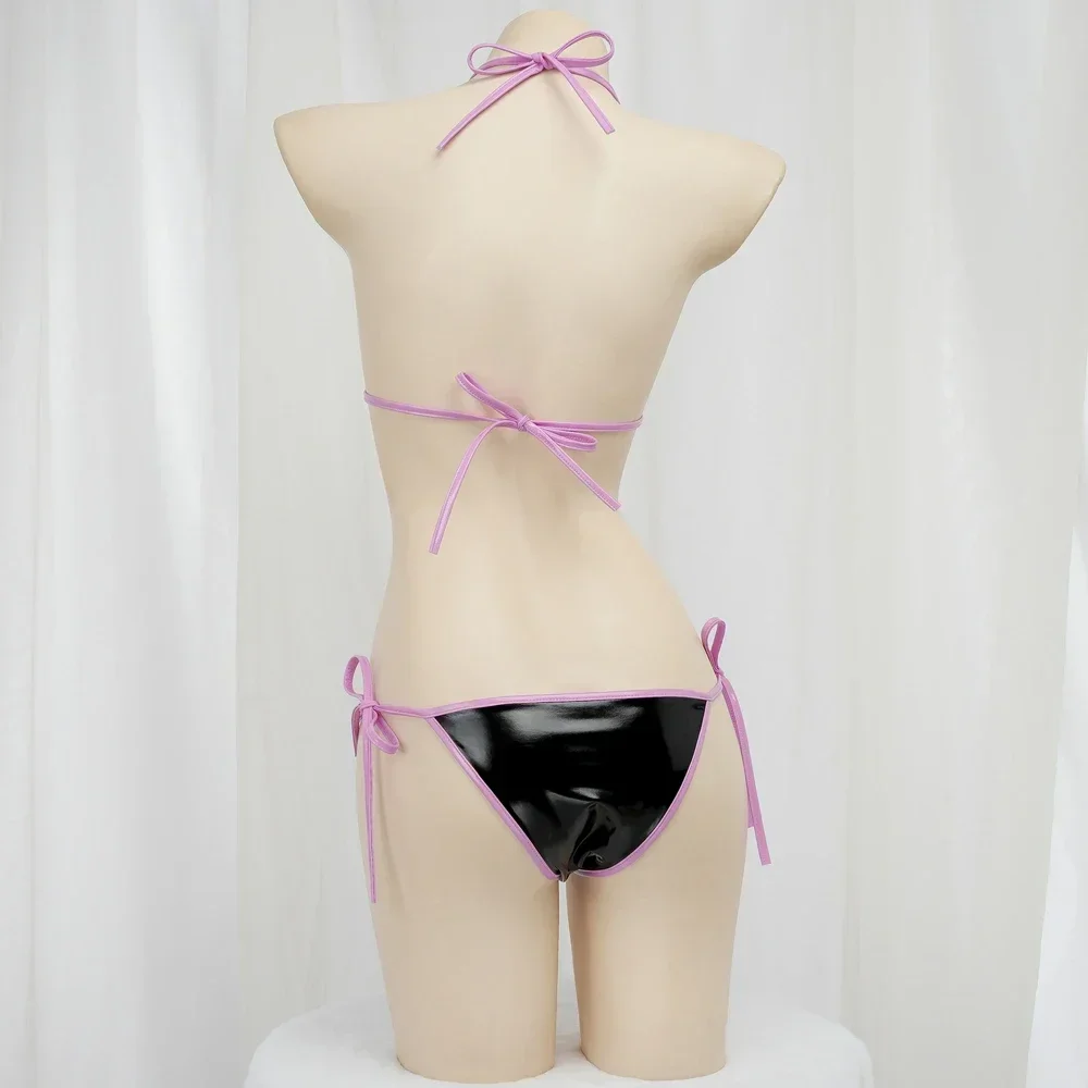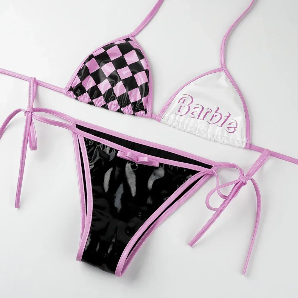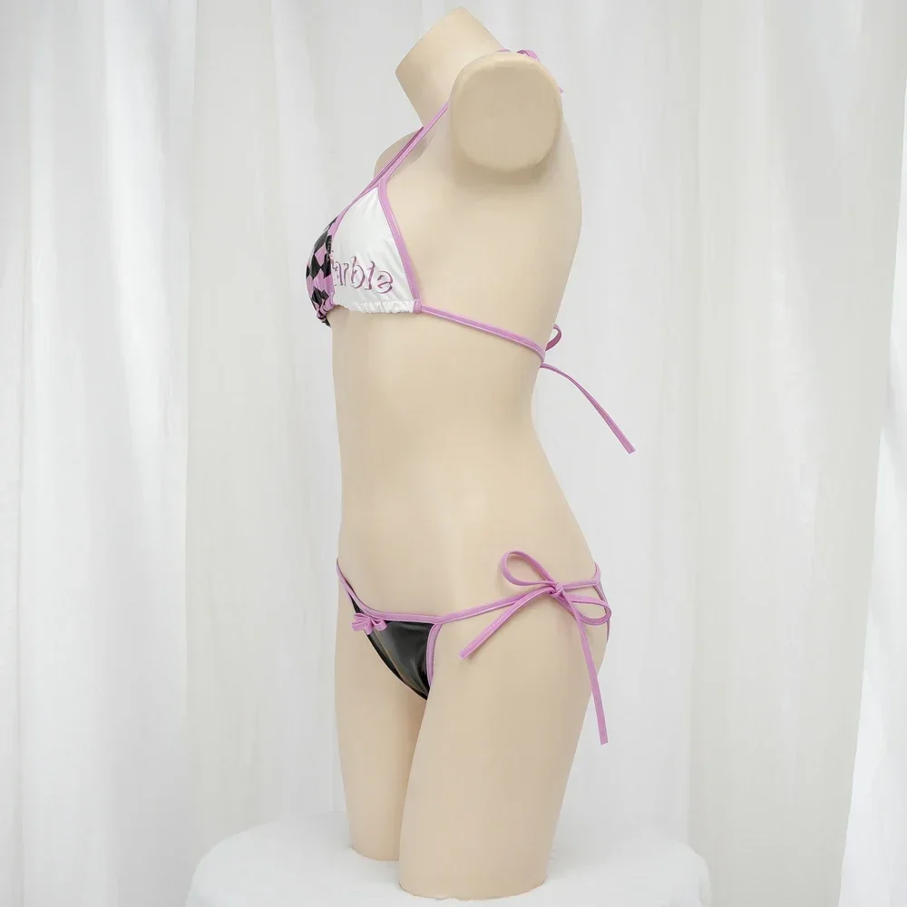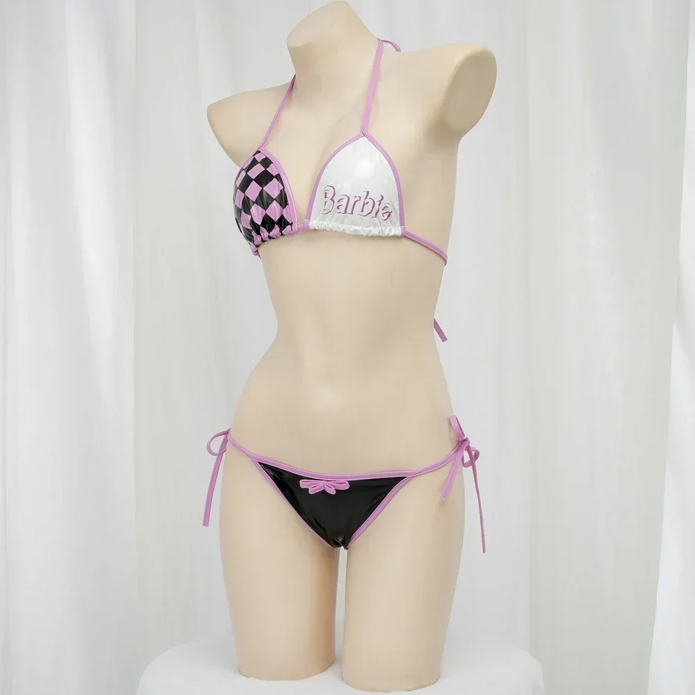 Women Three Point Underwear Set Cosplay Costume Barbie Cute Girl Pink Black Plaid Bikini Swimsuit