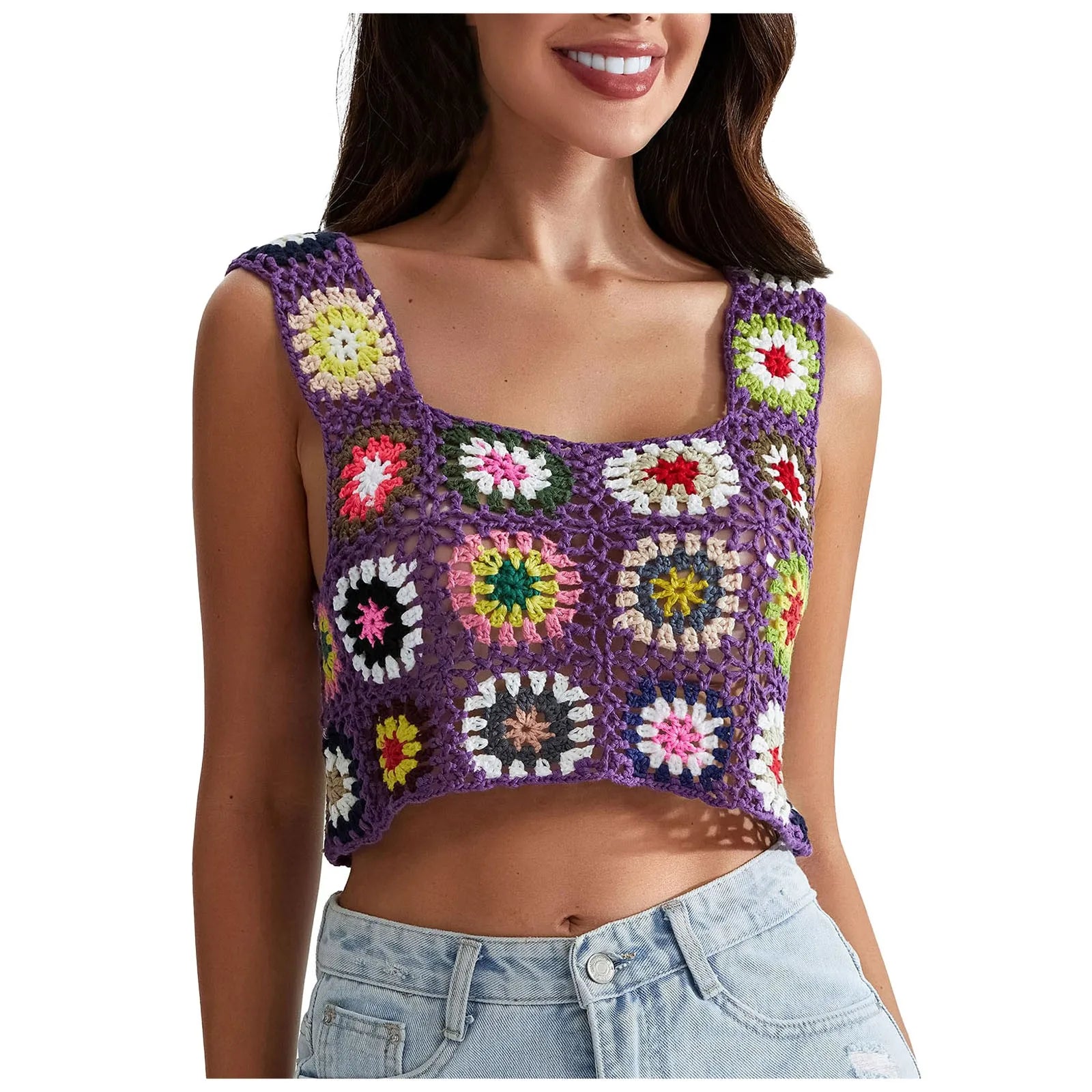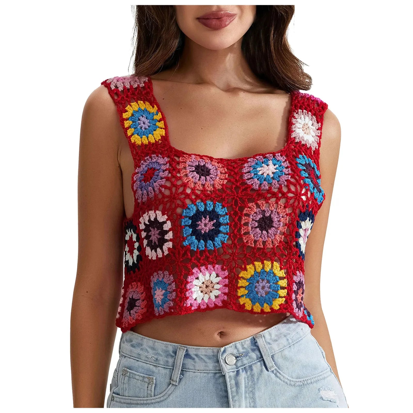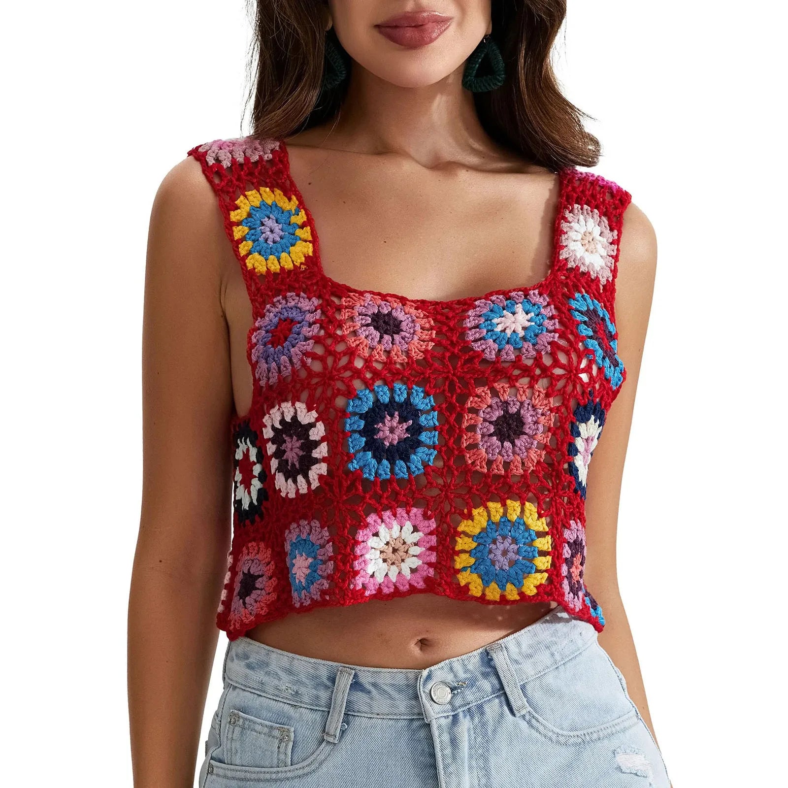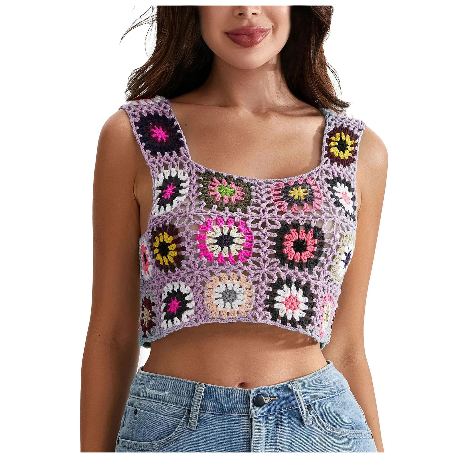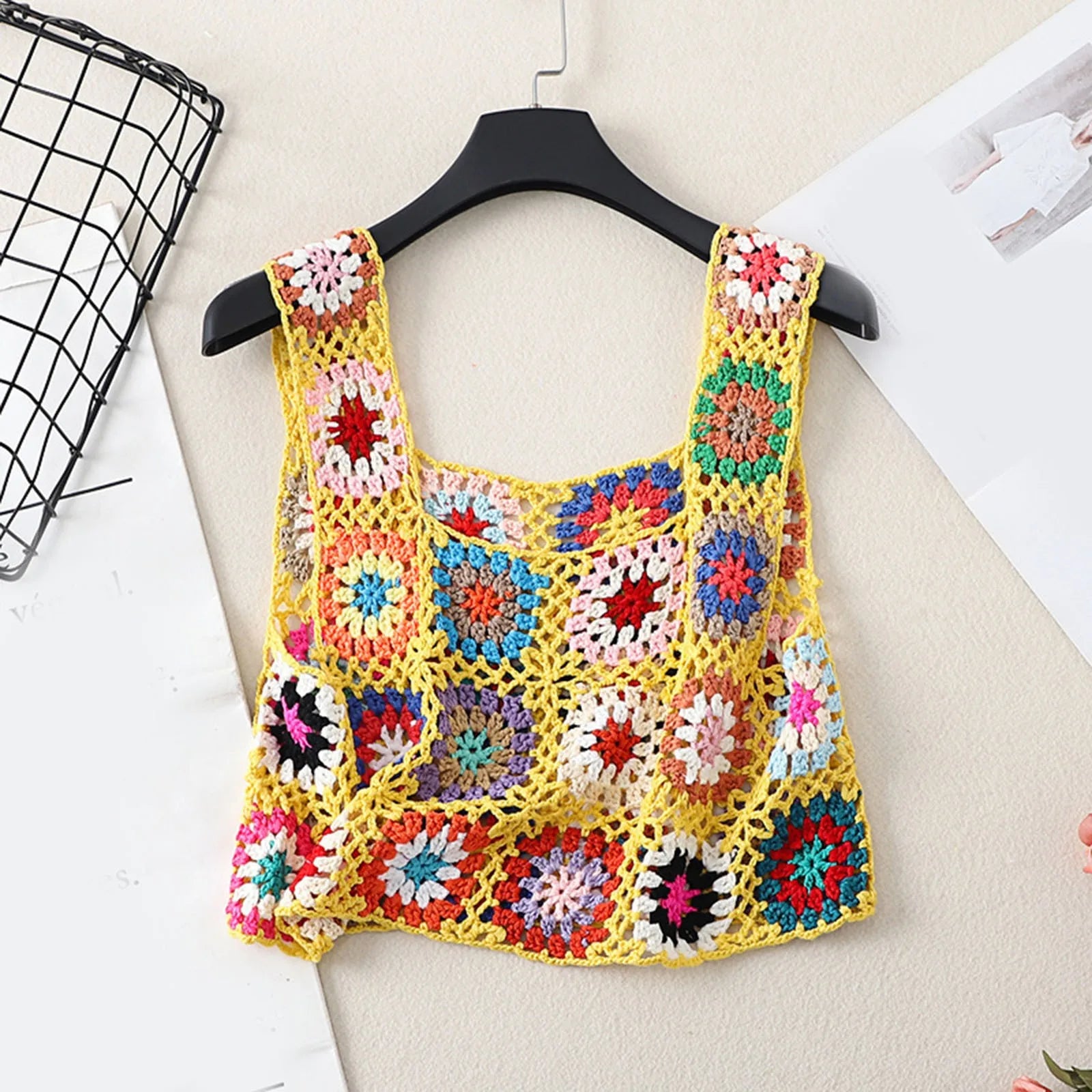 Womens Crochet Tank Top With Tassels Cover Ups Knit Colorful Floral Embroidery Summer Boho Camisole Hollow Out Beachwear