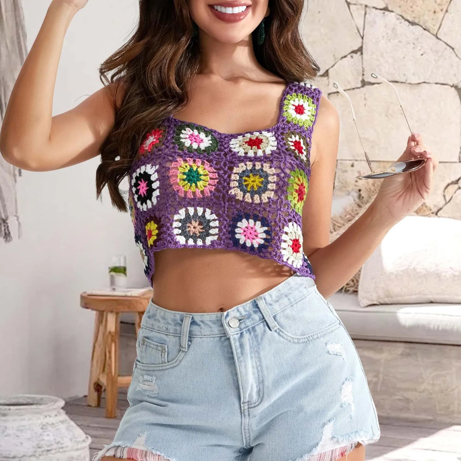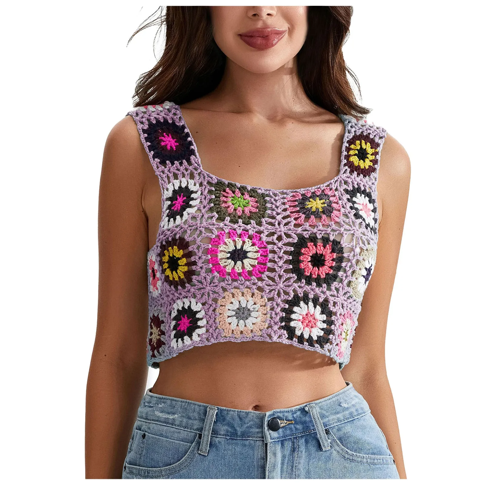 Womens Crochet Tank Top With Tassels Cover Ups Knit Colorful Floral Embroidery Summer Backless Camisole Fashion Casual Bohemian